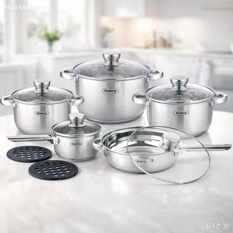 Комплект съдове Rosberg, 12 части, 2 подложки, Неръжд.стомана