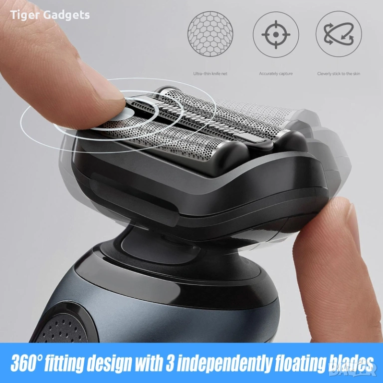 Изработена от неръждаема стомана, главата позволява както сухо, така и мокро бръснене, като осигурява комфорт и издръжливост. Бионичният дизайн на мрежата подобрява контакта с кожата и улавя повече косъмчета с едно движение.