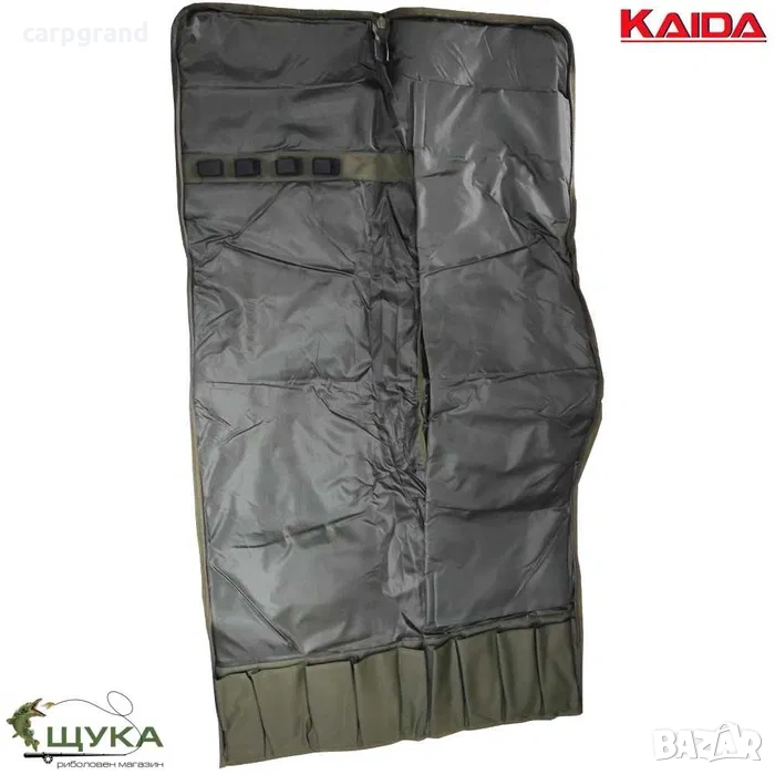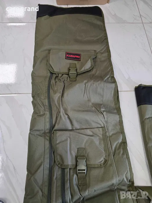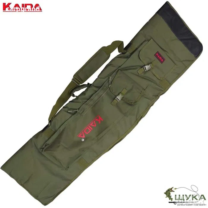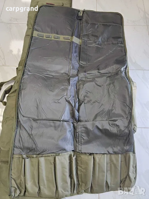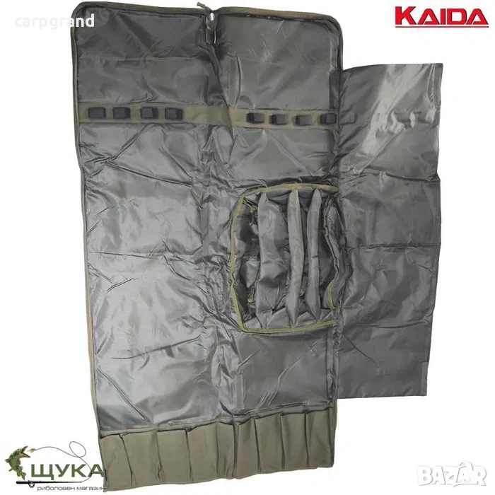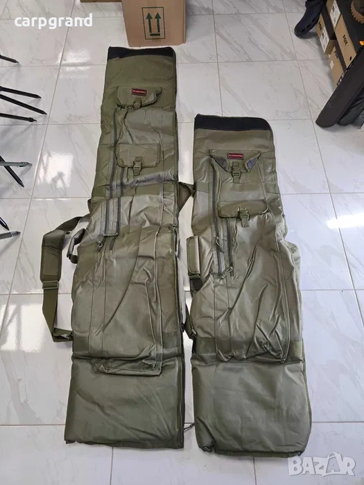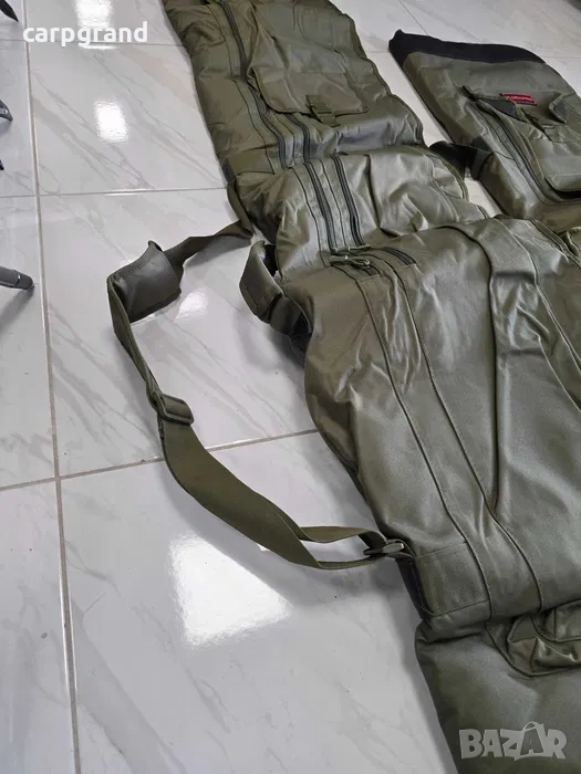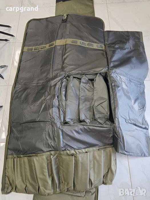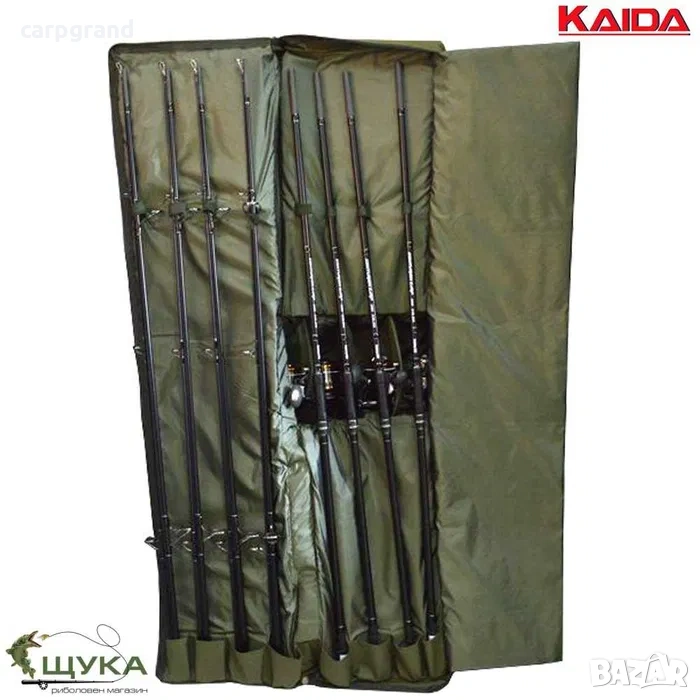 Луксозен шаранджийски калъф 4 пръчки от 2 части, оборудвани с 4 макари.Пръчките в калъфа се застопоряват чрез велкро лепенки на и отделно всяка една пръчка си влиза в собствено оформен джоб в долната част /дъното/ на калъфа. Проектиран и създаден от висококачествена и сигурна 600D материя, със здрави и надеждни ципове, този калъф представлява сигурна защита за Вашият шаранджийски арсенал.Превъзходен шарански калъф за транспортиране на въдици и макари с голям капацитет.Калъфът е с два странични джоба където могат да се поставят колчета или други аксесоари за шарански риболов.Изработен от и здрав брезент с двойно подсилени шевове и здрави ципове.Дебело подплатен за пълна защита на въдиците и макарите от нараняване Дължина: 145см. Цена 110лв