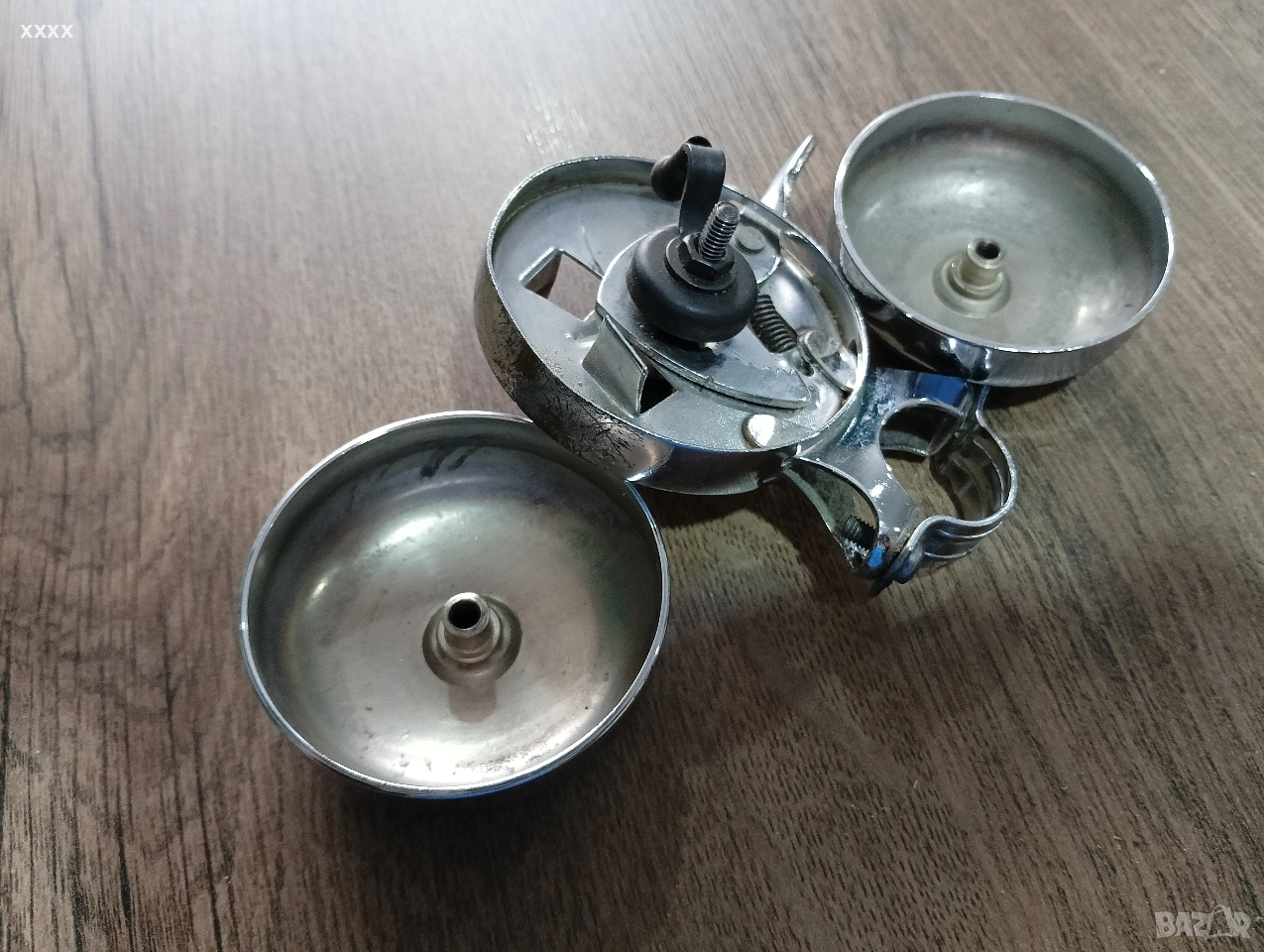 Стар масивен вело звънец. Средата е неподвижна а се въртят двете страници и звъни много силно.