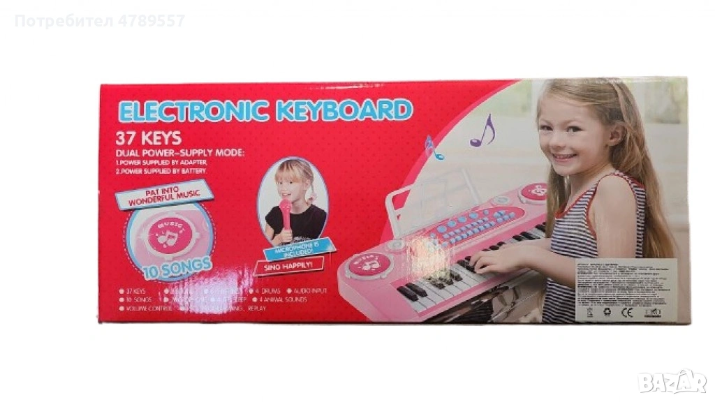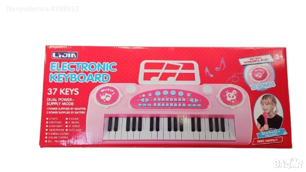 Тип продукт: Музикален инструмент; Възраст: 3+ години; Материал: Пластмаса; Цвят: Розово; Работи с 4 AA батерии (не включени) или адаптер (включен кабел); Размери: 48 см x 20 см; Развиване на умения: Координация на ръцете и очите, въображение, сензорни умения; Включени звуци: 8 музикални инструмента, 8 музикални жанра, 4 барабанни звука, 4 животински звука; 10 предварително заредени песни, функции за запис и възпроизвеждане; Гаранция: 12 месеца.