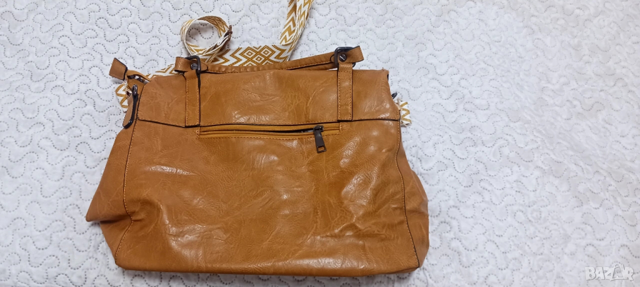 Жълта дамска чанта от здрава изкуствена кожа. Почти не е носена. Никакви забележки по кожата и подплатата. Размери: ширина 40 см, дължина 25 см. Дълга широка, цветна дръжка.