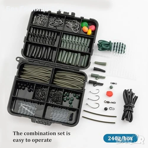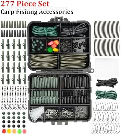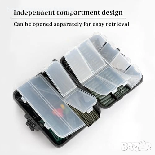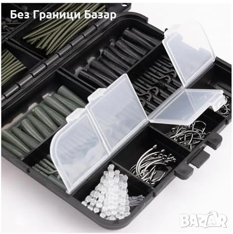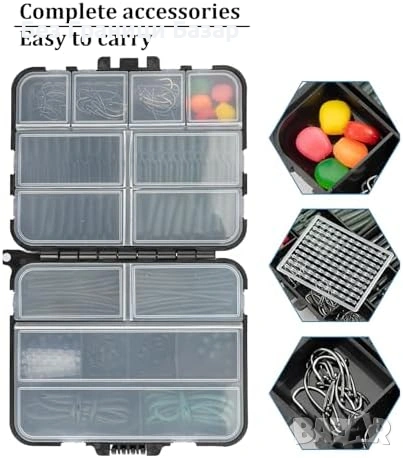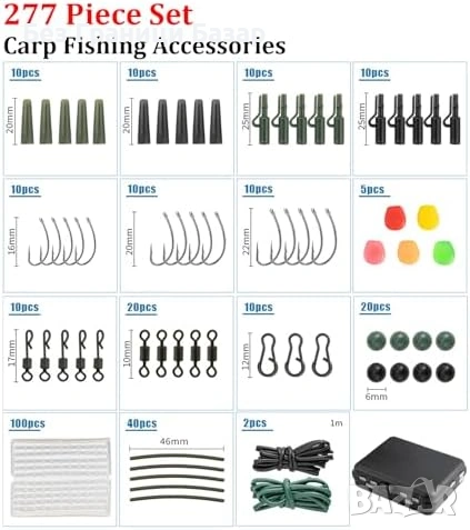 Включва куки, клипсове, стопери, мъниста, тръбички и примамки