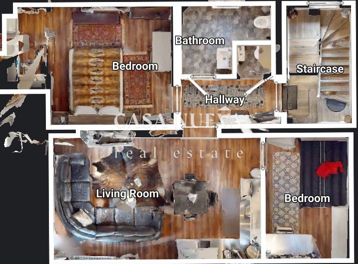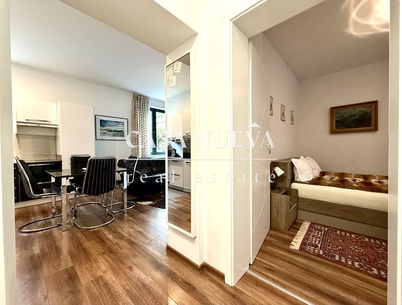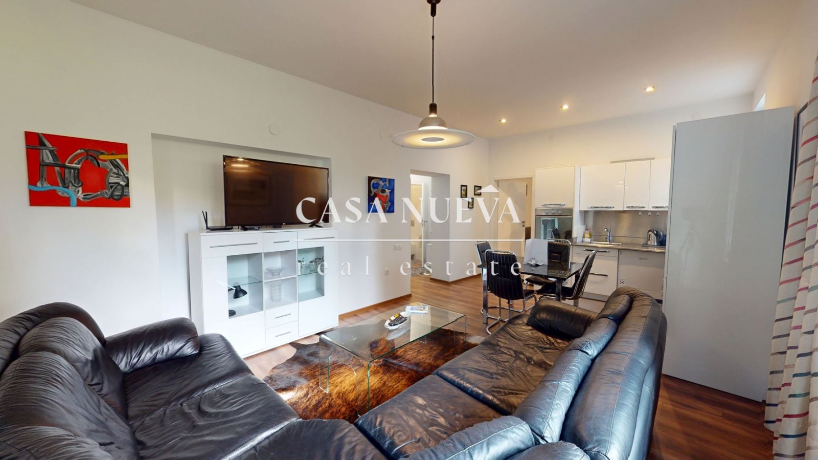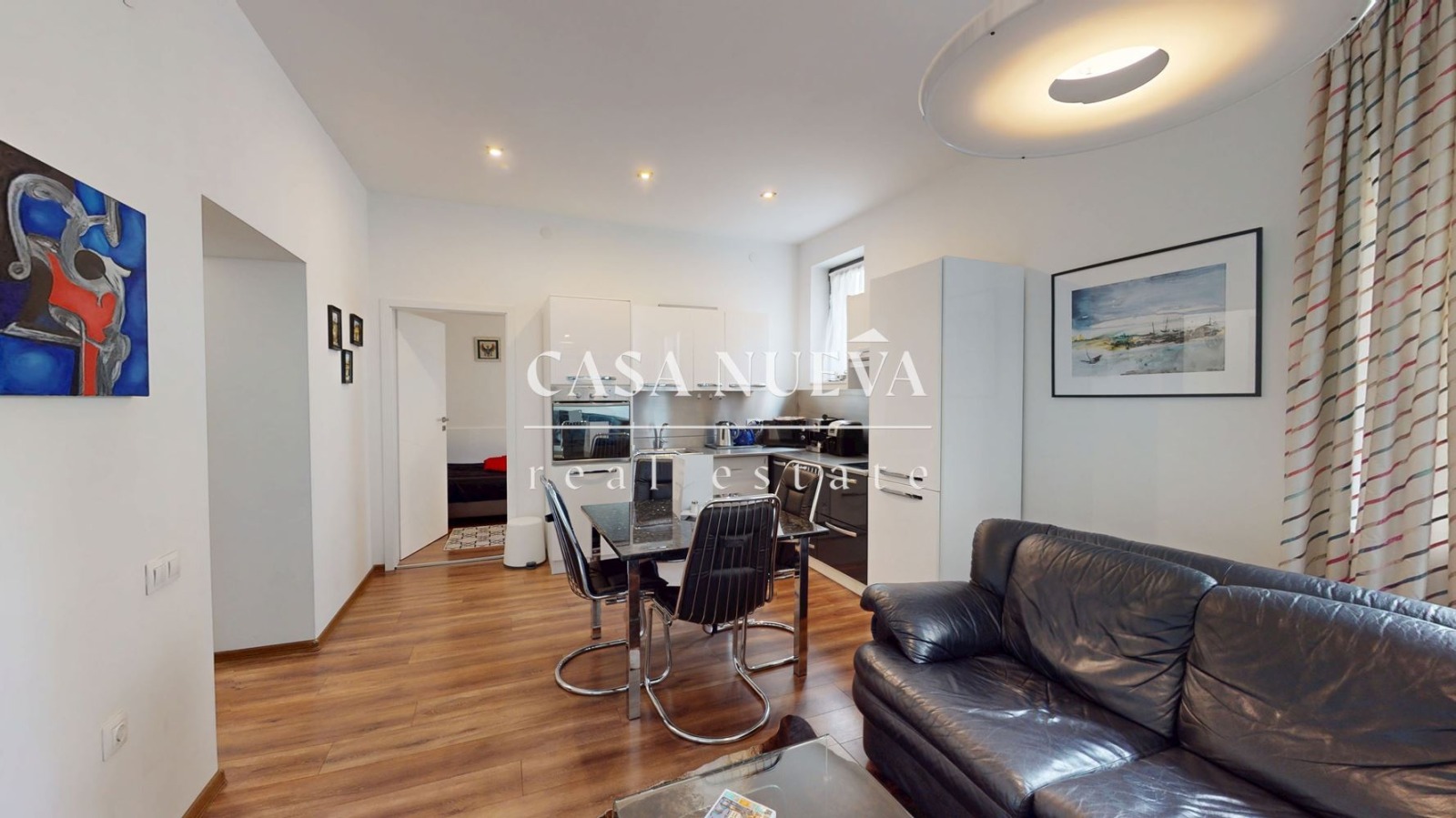 Жилището разполага с функционално разпределение, включващо коридор, просторна дневна с кухненски бокс, две спални,