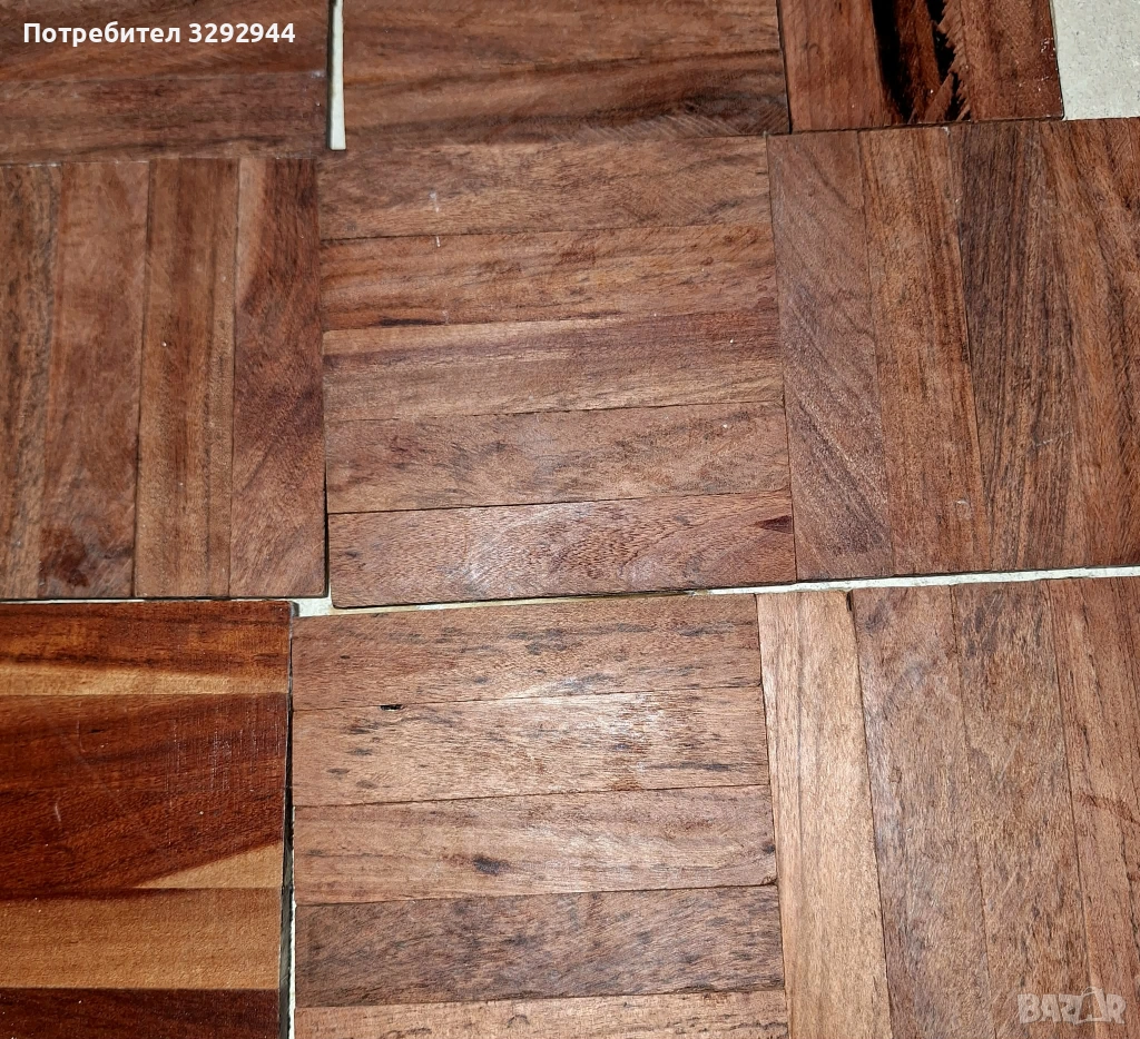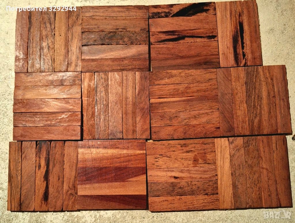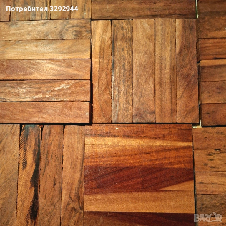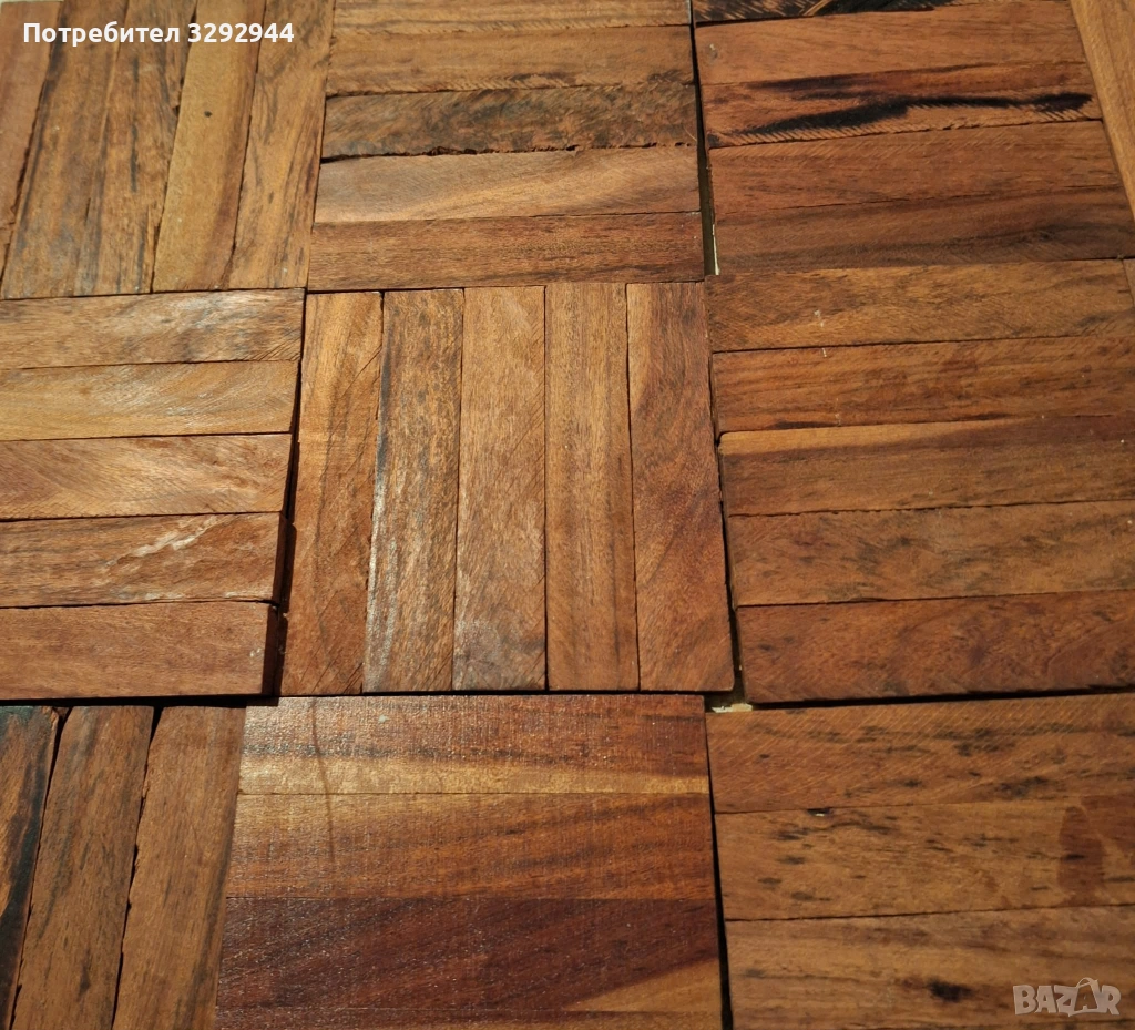 Продавам около 30 кв.м нов тиков паркет.Много добре изсъхнал,съхраняван доста години .Малките елементи са подредени в квадрати,залепени върху мек материал/може би хартия/.Някои квадратни парчета са се разделили.Т.к. е съхраняван на купчинки,при интерес ще дам по точна квадратура.Много е подходящ и за стенни облицовки поради размерите.