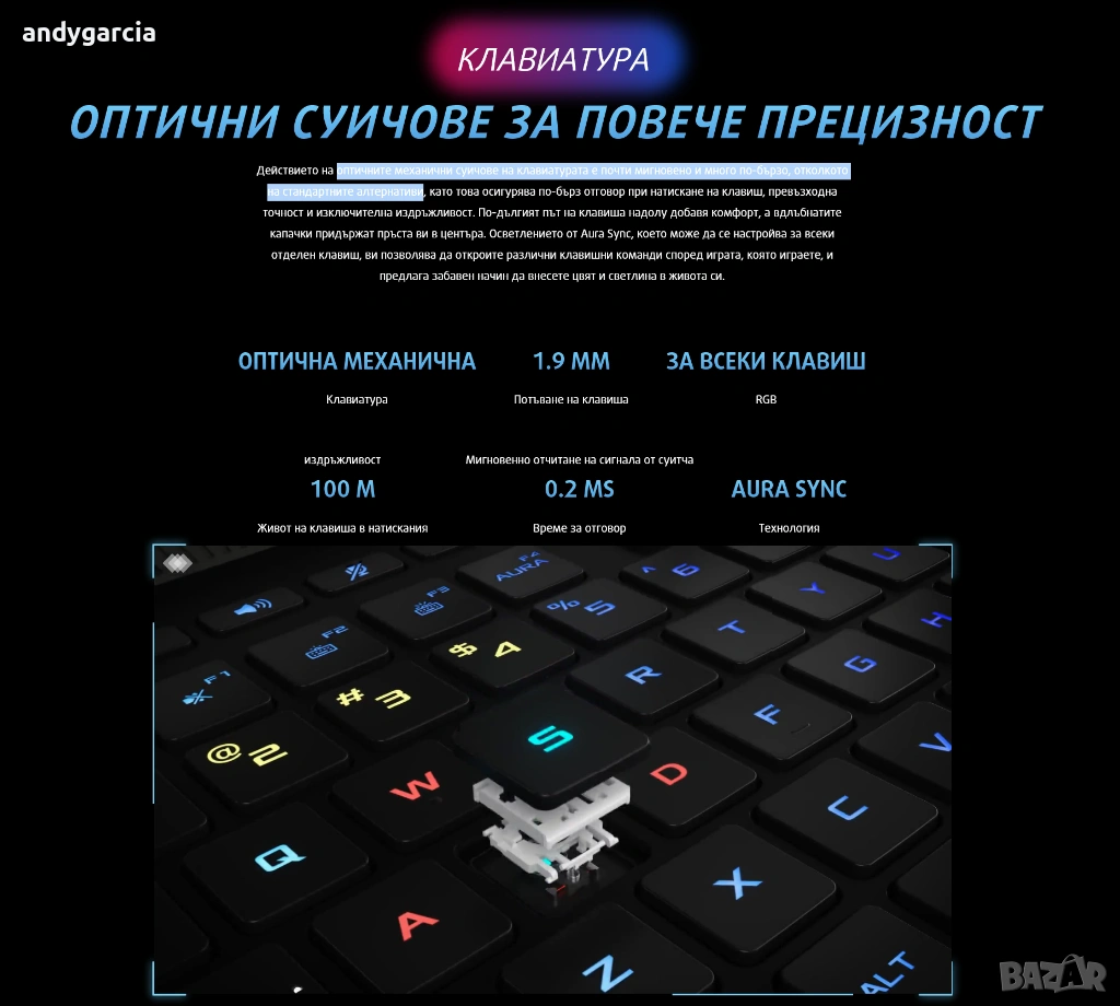 - RGB осветена клавиатура, която с оптичните механични суичове реагира