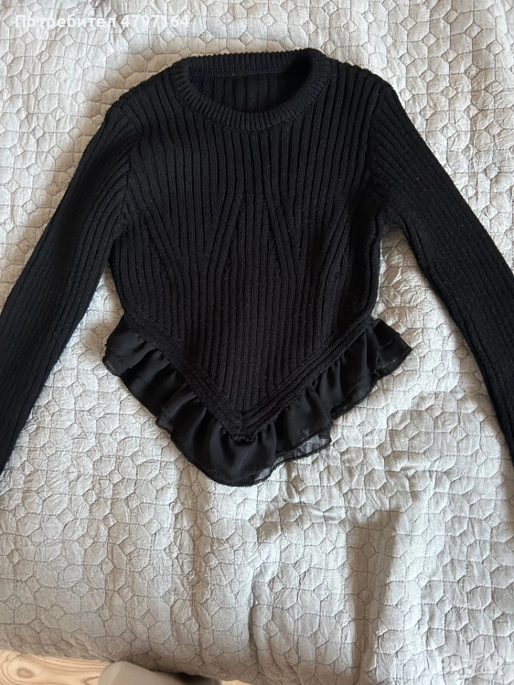 Стилен къс черен пуловер от Little Black Dress, изработен от много приятна и мека материя. Моделът е с красив дантелен ефект в края, който придава нежност и елегантност.
