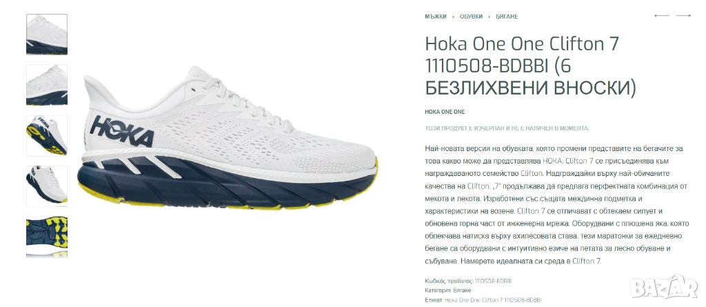 Hoka Clifton 7. Тази версия е известна със своя баланс между омекотяване и лекота, като включва междинна подметка от EVA пяна по цялата дължина и технологията Meta-Rocker за по-ефективно бягане.