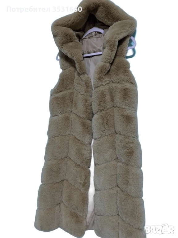 Дамски дълъг, пухкав елек от изкуствена кожа цвят капучино с качулка ( несваляща) на марката FASNION. Нов. Размер- S/M.