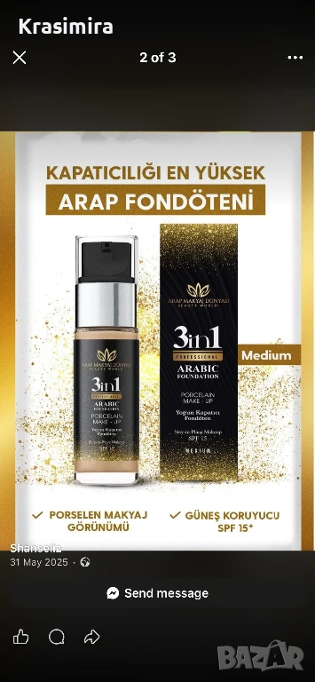 Предлагам висококачествен арабски фон дьо тен 3в1, който съчетава перфектно покритие, грижа за кожата и слънцезащита в един продукт. Формулата осигурява естествен завършек, като прикрива несъвършенства, изравнява тена и придава свеж и сияен вид.