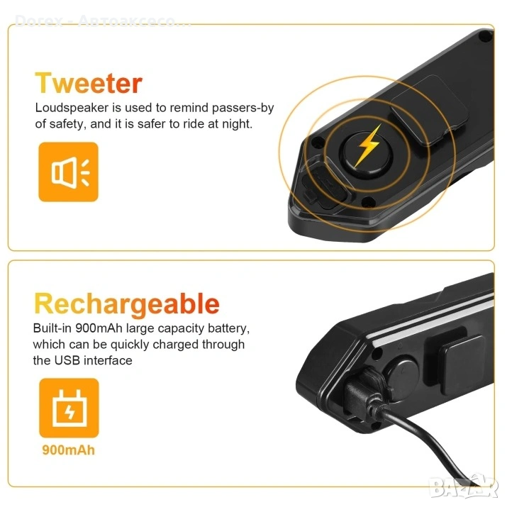 Устройството разполага с вградени LED мигачи, постоянна и мигаща светлина, както и мощен клаксон, управлявани удобно чрез безжично дистанционно. Благодарение на широкия ъгъл на светене от 180°, водачът е добре видим от всички страни, което значително повишава безопасността.