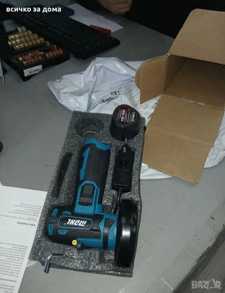 Безчетков ъглошлайф 12V - прецизно рязане и шлайфане. Технически характеристики на Безчетков ъглошлайф 12V - прецизно рязане и шлайфане Кратък технически пакет за бърз преглед: Материал: Неръждаема стомана + ABS; Напрежение: 12V; Батерия: 12V 1200 mAh литиева батерия; Скорост (RPM): 19 500 об/мин; Максимален диаметър на острието: 76 мм; Отвор на триона: 10 мм; Винт на притискащата плоча: M5; Тегло: около 700 g; Приложения: рязане на дърво, метал, плочки, PVC; шлайфане и полиране; заточване; премахване на фуги; работа в труднодостъпни места.