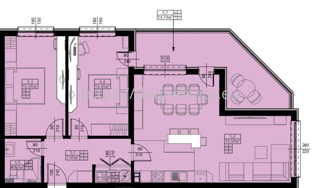 Предложението е за тристаен апартамент на трети жилищен етаж със застроена площ от 105,75 кв.м. + 13,75 кв.м. общи части с разпределение: коридор, дневна с кухненски бокс, две спални, баня със санитарен възел, мокро помещение и тераса. Свободни тристайни апартаменти на втори, трети и четвърти жилищен етаж.