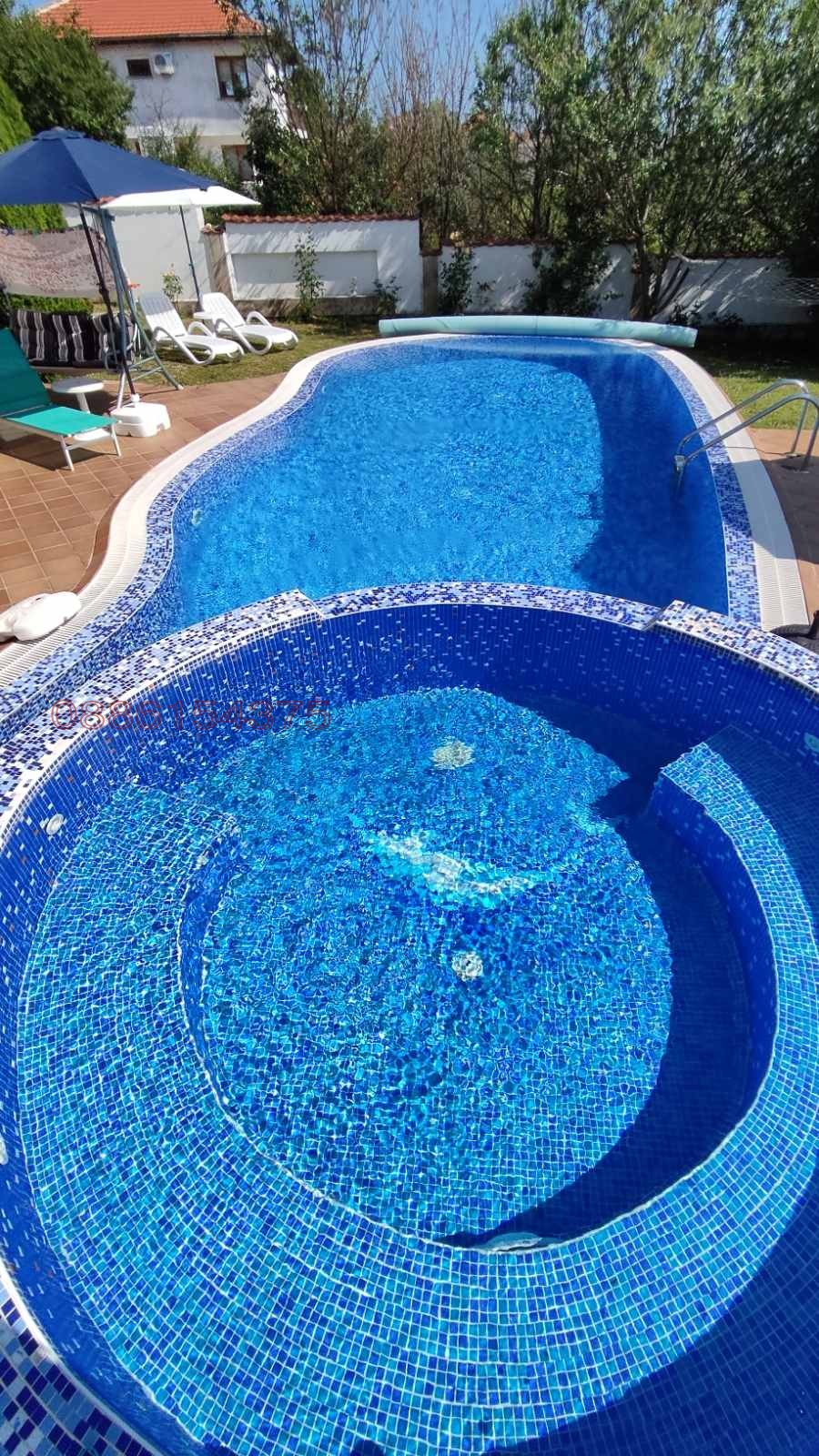 БАСЕЙН и ДЖАКУЗИ с обем от около 100куб.м с изградена отоплителна система. LED цветно осветление. ДВОРЪТ е покрит с клинкерни плочи и обширни зелените площи. Разнообразие от растителни видове, автоматична поливна система (RAIN BIRD) и градинско осветление със сензори.