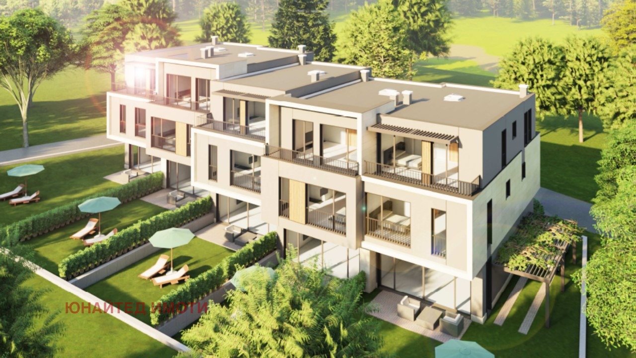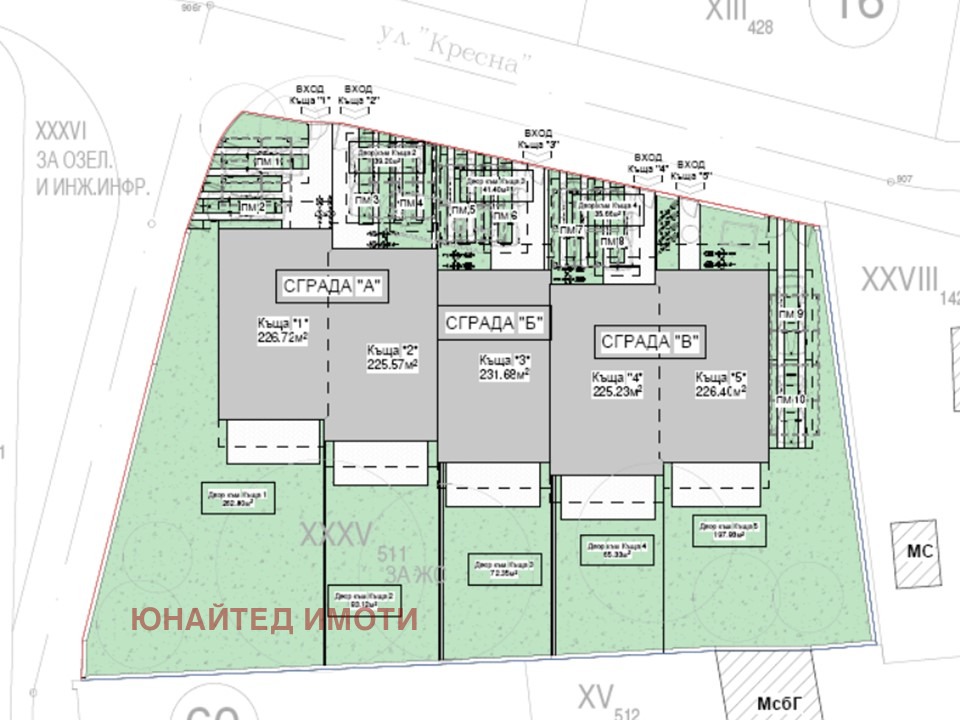 Обширни прозорци, отопление на газ и термопомпа, зелени дворове, асфалт и газ.