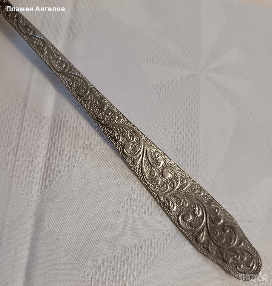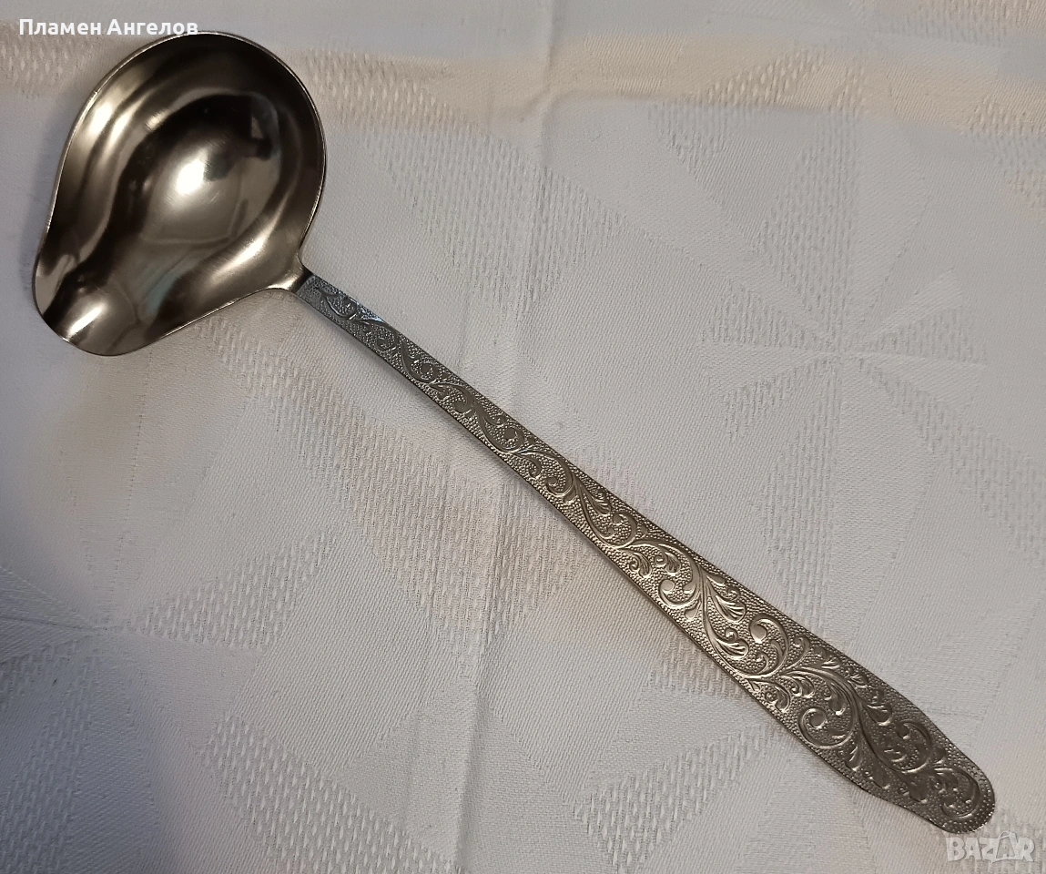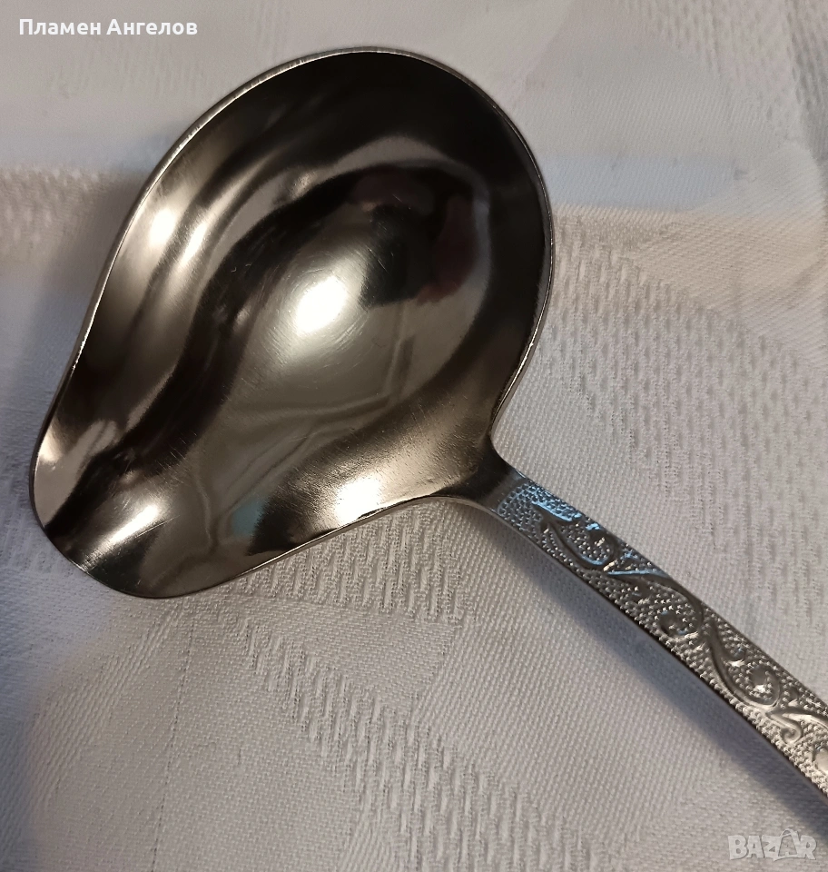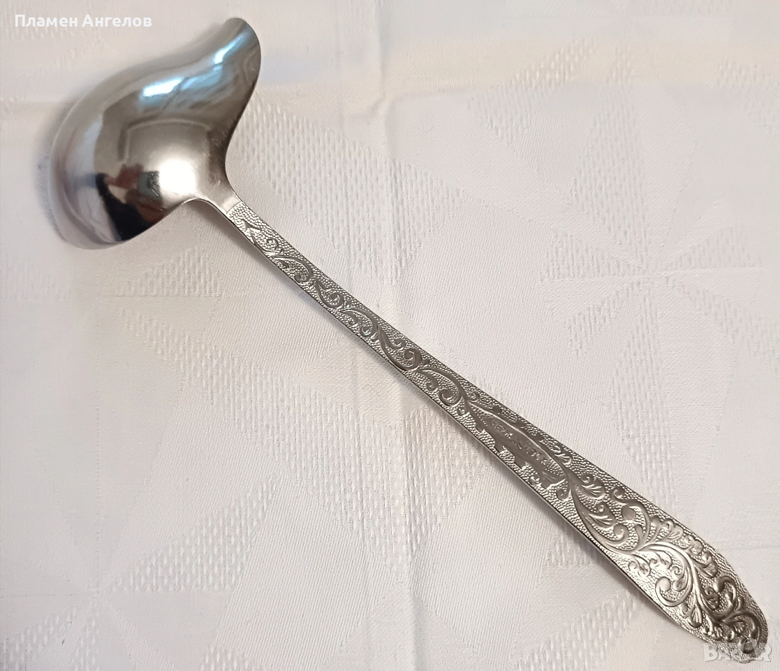 Изящен винтидж черпак(лъжица) за сос от съветската епоха. Отличава се с красива, детайлно гравирана дръжка с флорални мотиви и практичен чучура за прецизно сипване. Висококачествена сплав. Някъде го изписват че е от Мелхиор с частично фино посребряване. Чисто нов, неопотребяван, неизползван. Със фабричен блясък. Без забележки.