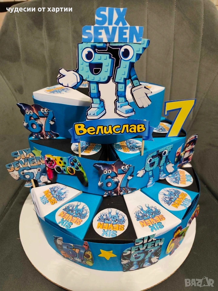 Изработвам торти от хартия/картон. Парче от картон 0.80€. Празно Моделите са по желание на клиента. Цените с пълнеж започват от 1,60-2,10€ и включва пълнеж (който е уточнява по телефона или Съобщение, Вайбър). Надпис с името и годините на детето, подложка и украса от картинки на клечки, както и цялостната украса на тортата се доплащат 6 лв