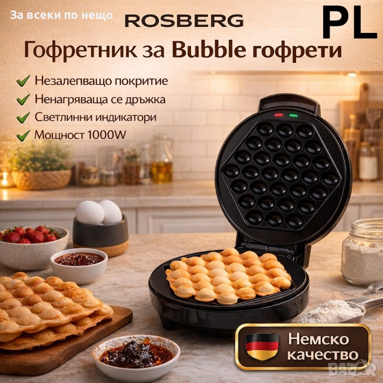 Гофретникът за Bubble Waffle Rosberg R51442H е перфектният уред за приготвяне на модерните и изключително вкусни bubble гофрети, популярни по целия свят. С мощност от 1000W и висококачествени плочи с незалепващо покритие, уредът осигурява бързо и равномерно изпичане на всяка гофрета.