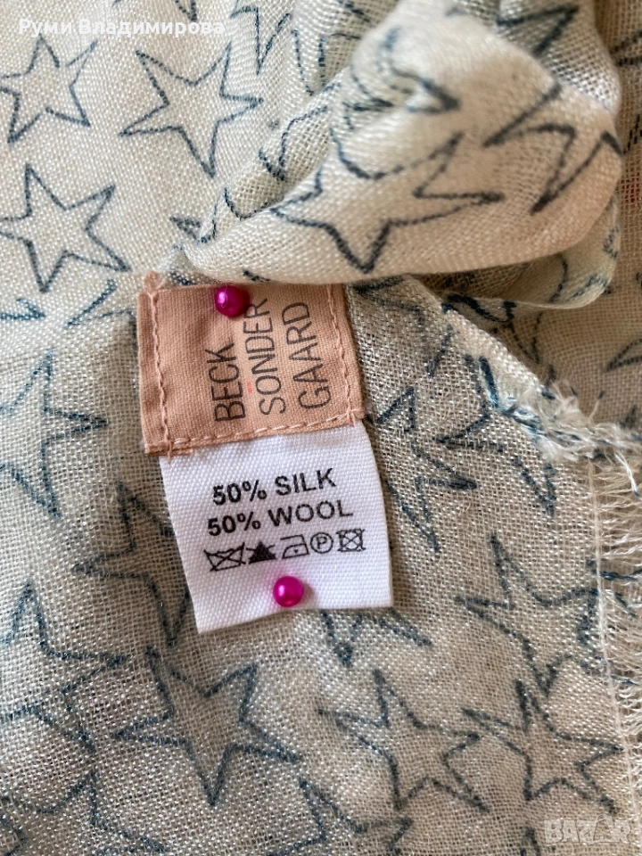 Бледорозов шал на вишневи звезди Beck Sondergaard от 50 % коприна и 50 % вълна, голям размер. фина, топла и мека материя, десен на звезди, доставка с Еконт, цена 15€.