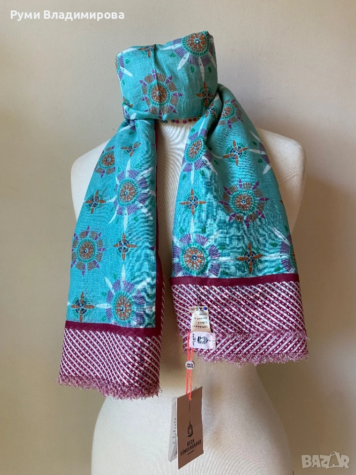 Син шал Beck Sondergaard от 100 % памук, с етикет, направен в Индия, принта е ръчно направен, тънка, фина материя, размер 130 Х 130 см, нов, доставка с Еконт. Цена на етикета 29€.