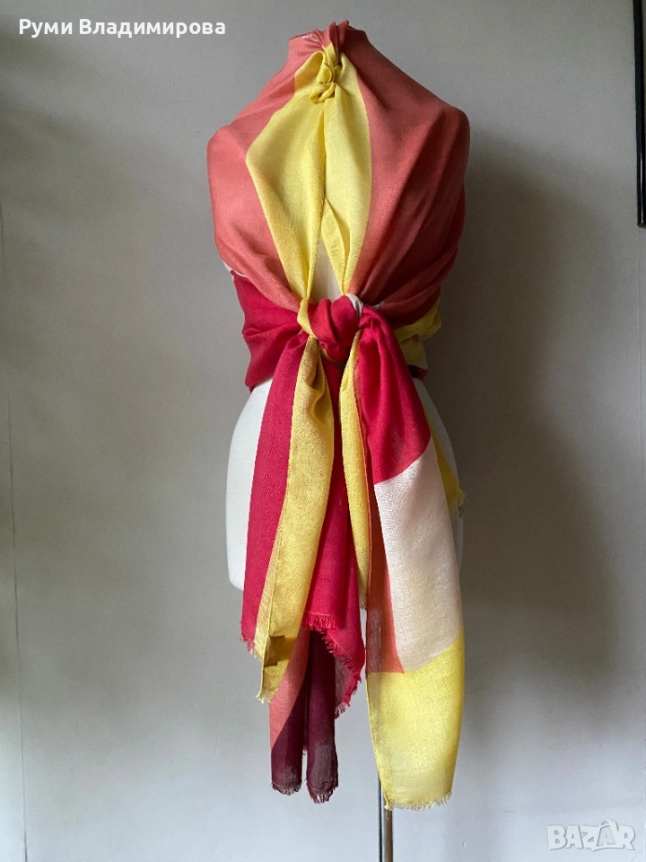 Голям шал Beck Sondergaard oт 50 %коприна и 50 % вълна, цветове в топлата гама - жълто, прасковено розово. вишнево, червено, бяло, фина и топла материя, доставка с Еконт, цена