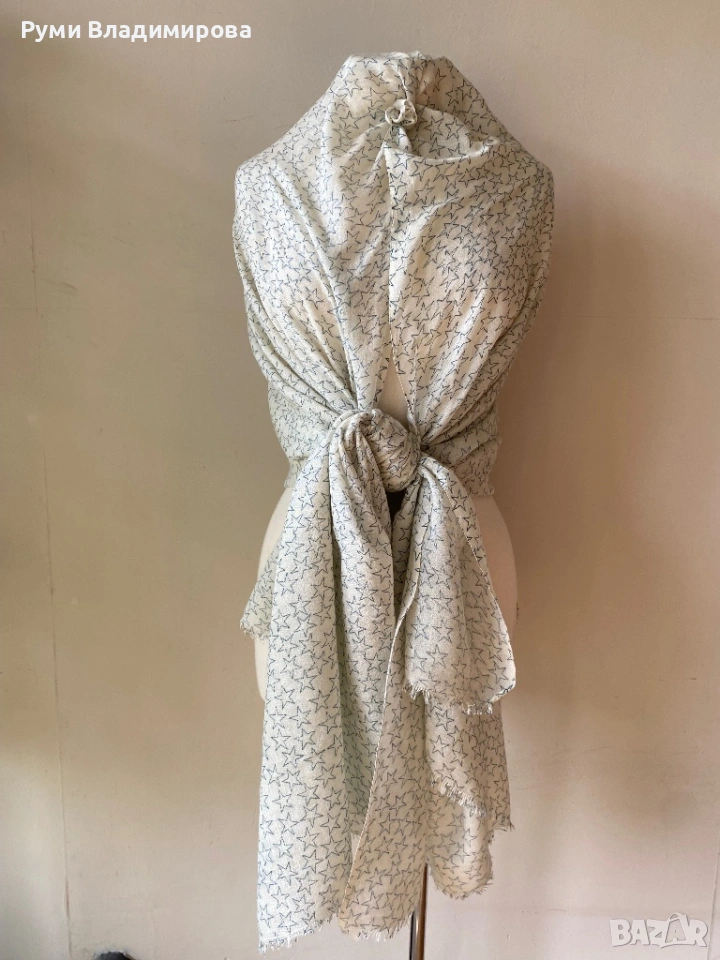 Голям, бял шал на малки сини звездички Beck Sondergaard oт 50 %коприна и 50 % вълна, фина и топла материя, доставка с Еконт, цена 15 €.