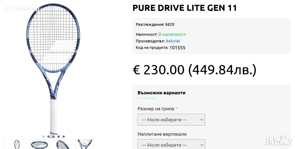Продавам тенис ракета Babolat Pure Drive Lite GT . Ракетата е в добро състояние.Висок клас ракета, с която играят много професионалисти и аматьори. На една от снимките може да видите, че актуалният модел на тази ракета се продава за 230 евро.