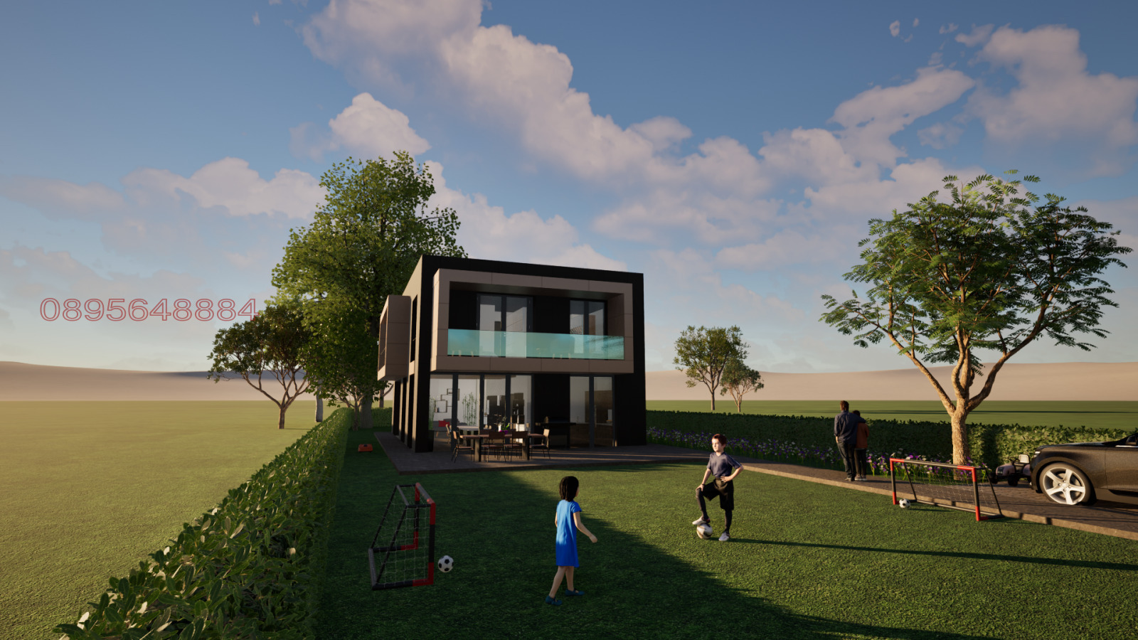 Къщата е проектирана с модерна архитектура плосък покрив, окачена фасада с HPL плоскости и декоративна мазилка, както и елегантни балкони с Etalbond. Пространствата са изключително светли и функционални, с височина на първия етаж 3,05 м и благоприятно южно изложение.