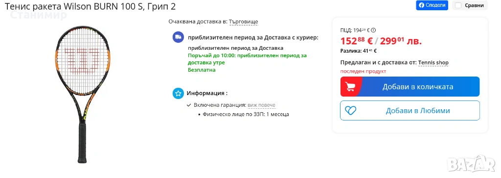 Продавам тенис ракета Wilson Burn 100LS .Това е популярна ракета използвана от професионални играчи и аматьори. Ракетата е много запазена. В момента е със скъсан кордаж, за да можете да я наплетете с кордаж по ваш избор.Цената е съобразена с това Ако нямате такава възможност, ще я наплета вместо вас срещу 10 евро.