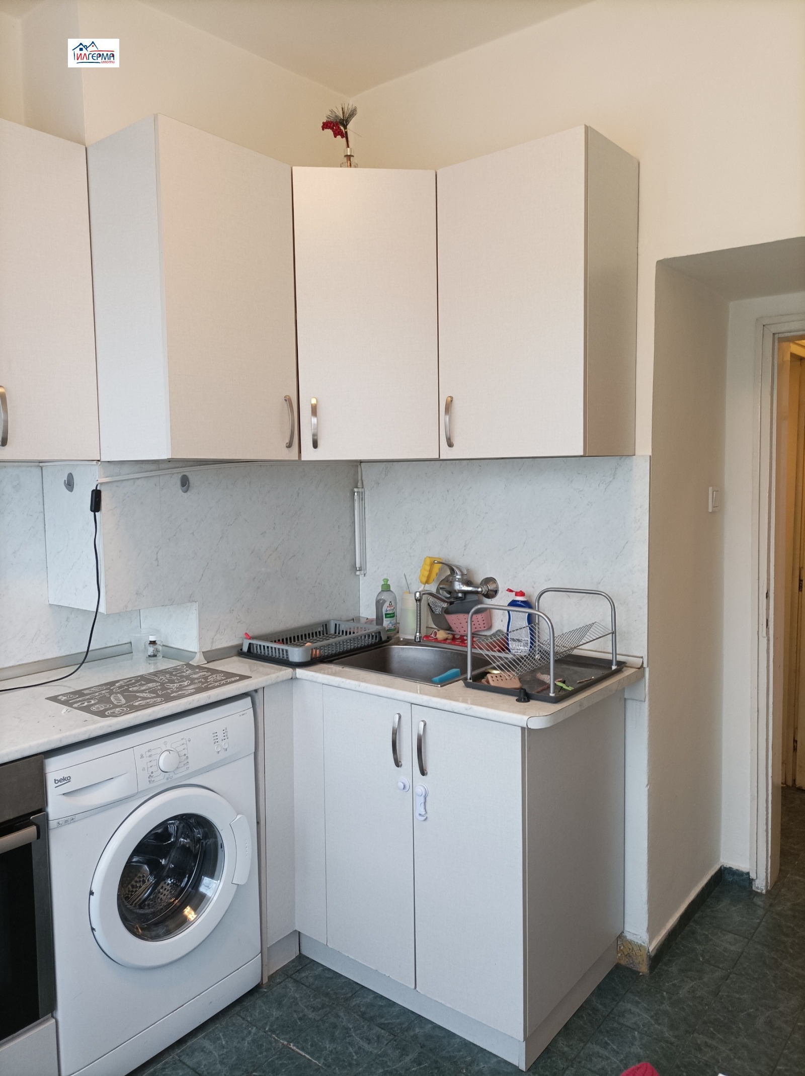 КУХНЯ: терак. плочки, латекс, долни и горни шкафове, кухн. плот, пералня 'ВЕКО', вградена ел. печка, керам. котлон, абсорбатор, хладилник, трапезни маса и столове, чугунен отопл. радиатор, изход към лоджия.