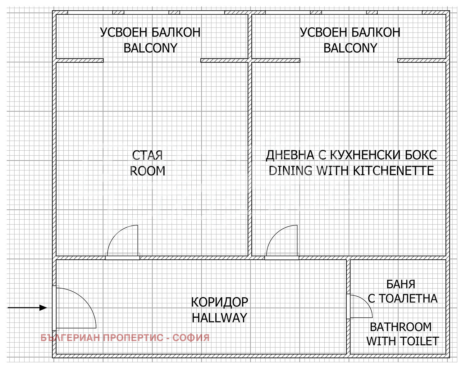дневна с кухненски бокс и усвоен балкон