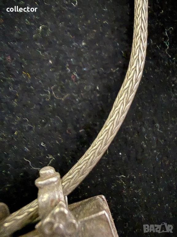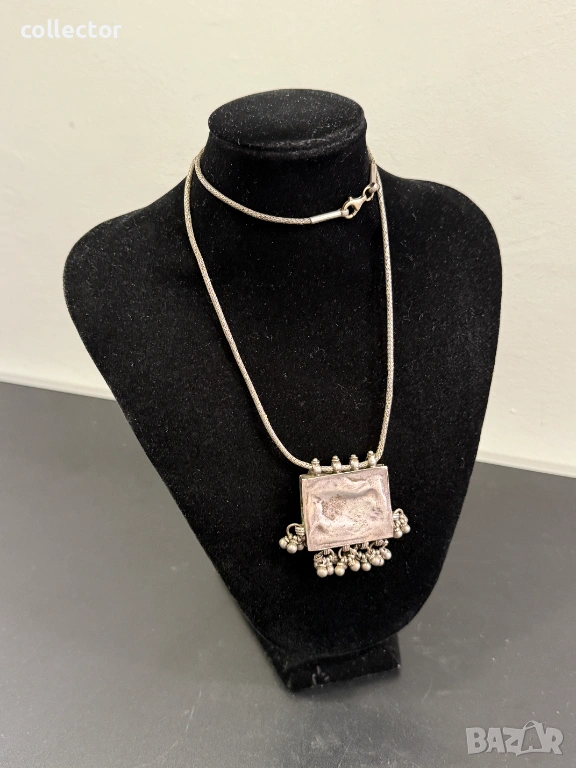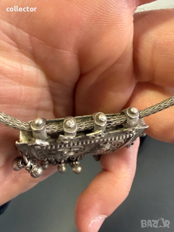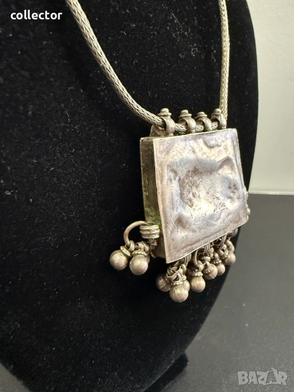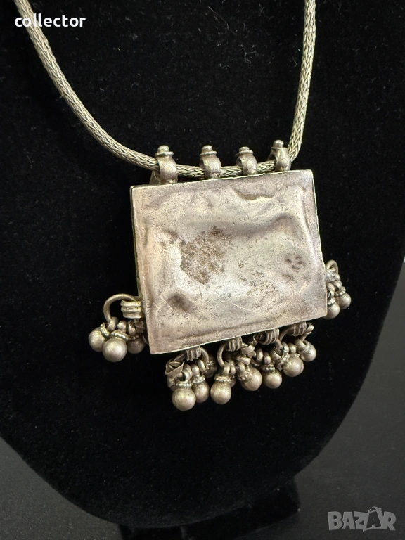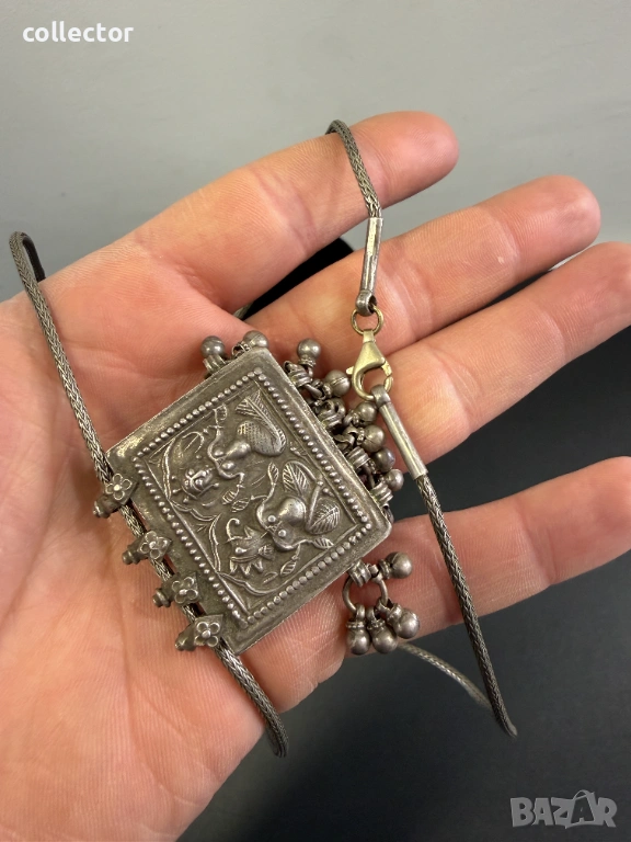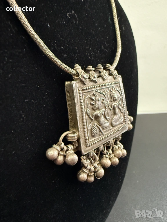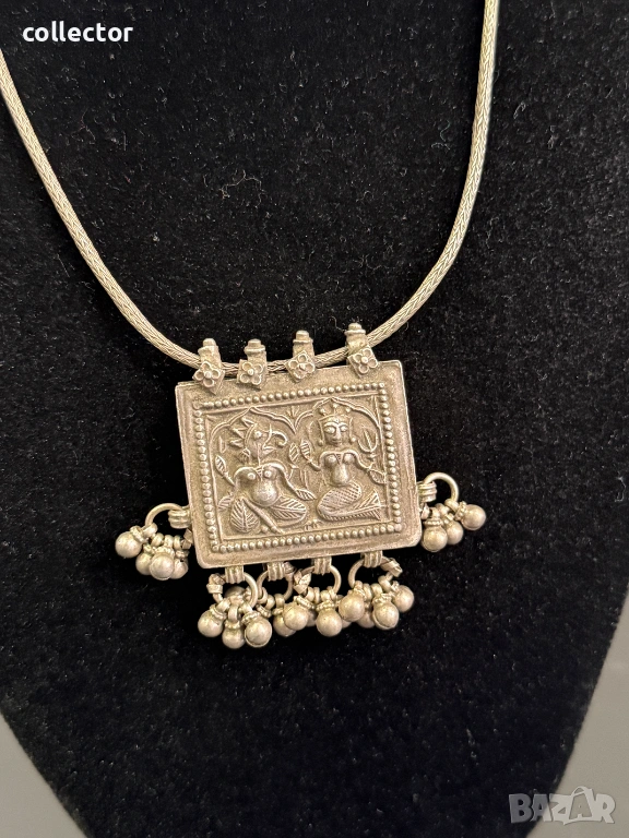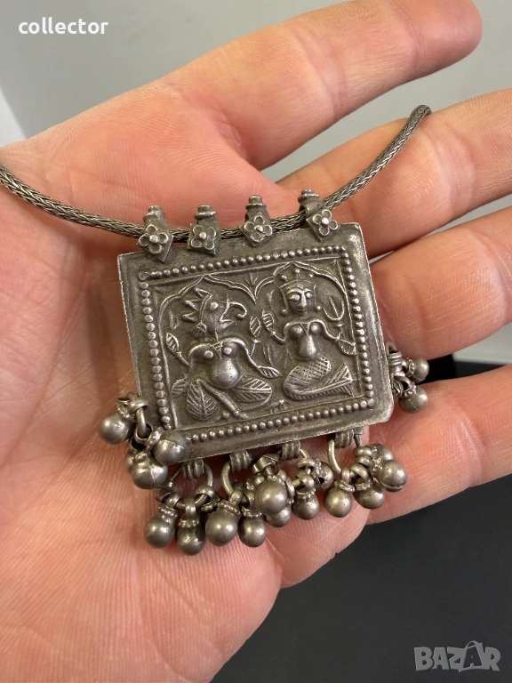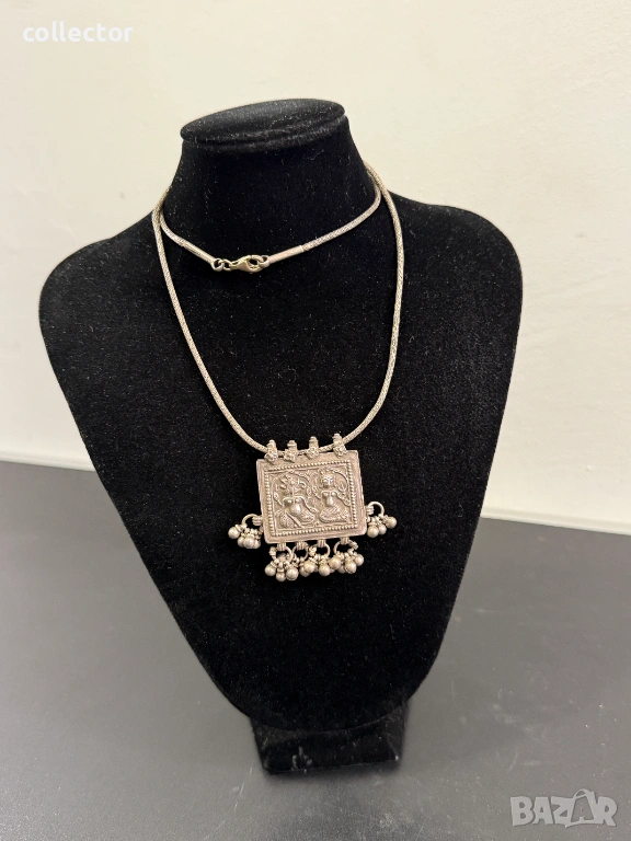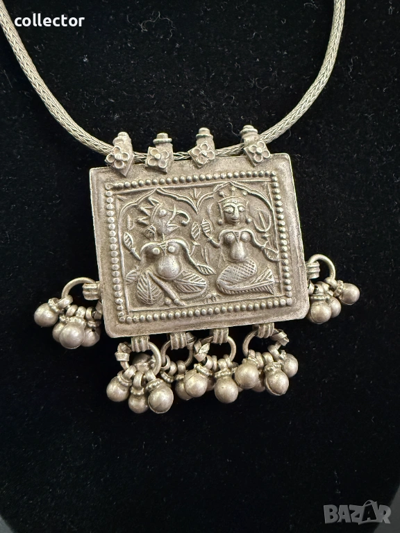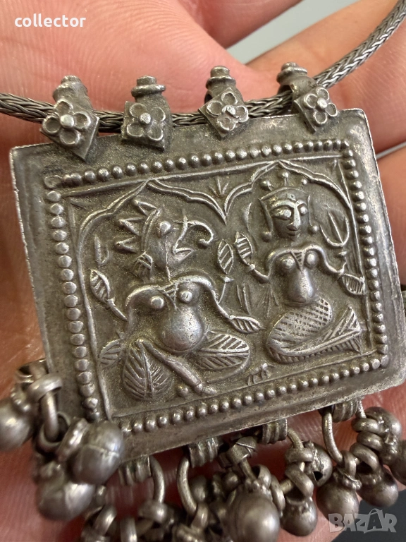 Върху медальона са изобразени индуистките божества Лакшми (богиня на изобилието и красотата) и Ганеша (бог на мъдростта и премахването на препядствията). Накита е изцяло ръчна изработка от високопробно сребро, закопчалката е сменена.
