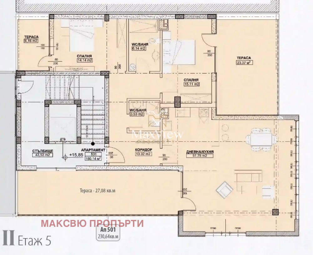 МаксВю Пропърти Ви представя тристаен апартамент с панорамна гледка в луксозна сграда пред Акт 16. Апартамент разположен на пети етаж, единствен на етажа и има следното разпределение: антре, дневна с кухненски бокс (51,57кв.м.) тераса, две бани със санитарен възел, спалня (15,11кв.м.), спалня(14,14 кв.м.), и тераса. Към апартамента има мазе 7.30 кв.м. Сградата е на пешеходно разстояние от метростанция Г.М. Димитров, Фантастико, Аптека, Парк,училище и детски градини. За строителството на сградата са използвани: -Зидария - високоенергийни тухлени блокове 25 см и преградни 12 см; -Дограма - алуминиева, ETEM E45 -Топлоизолация - EPS 10см - рьофикс -Положен тръбен път за климатици във всяка стая; -Входни врати блиндирани; Опция за пкупка на паркоместа на ниво сутерен. За повече информация: 0893 069 401; 0893 069 408 За повече информация и огледи: 0893069408 МаксВю Пропърти има удоволствието да Ви представи прекрасен тристаен апартамент в луксозна сграда пред Акт 16 Апартамент разположен напети етаж със следното разпределение: Антре, две бани със санитарен възел, спалня (15,11кв.м.),спалня(14,14 кв.м.), Дневна с кухненски бокс (51,57кв.м.), тераса (50 кв.м.) Сградата се намира на пешеходно разстояние от метростанция Г.М. Димитров, Фантастико, Аптека, Парк Студентски град,училище и детски градини. За строителството на сградата са използвани: -Зидария - високоенергийни тухлени блокове 25 см и преградни 12 см; -Дограма - алуминиева, ETEM E45 -Топлоизолация - EPS 10см - рьофикс -Положен тръбен път за климатици във всяка стая; -Входни врати блиндирани; За повече информация и огледи: 0893069408