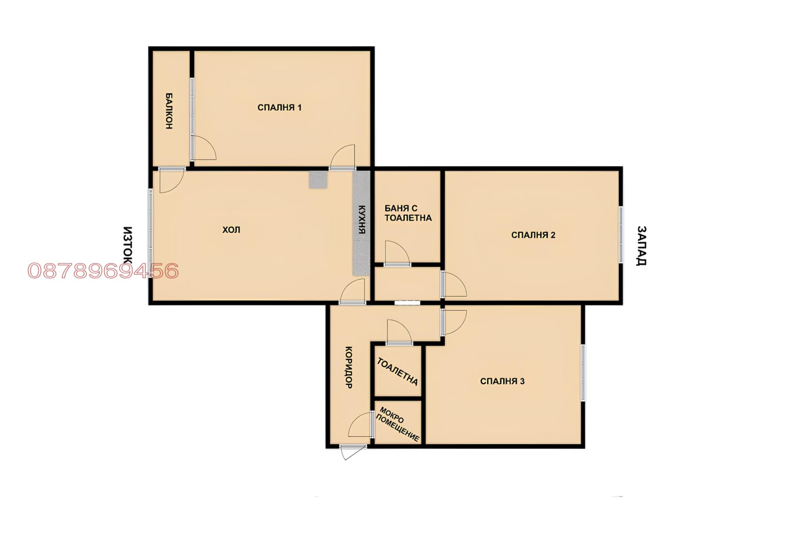Разпределение: Г-образен коридор, хол с модерна кухня, 3 самостоятелни спални, баня с тоалетна, отделна втора тоалетна, мокро помещение и тераса. Към имота има и мазе (4.47 кв.м.).