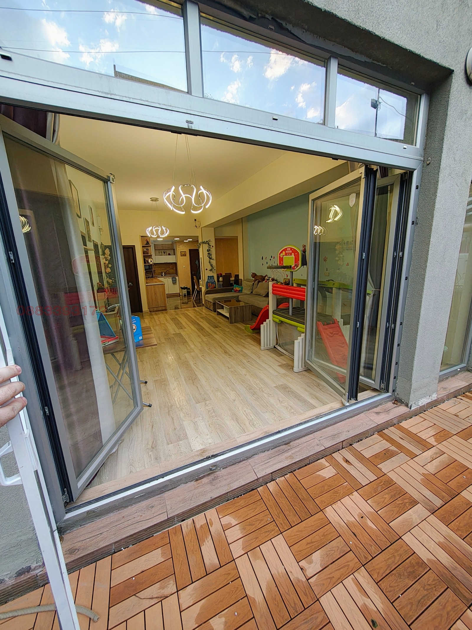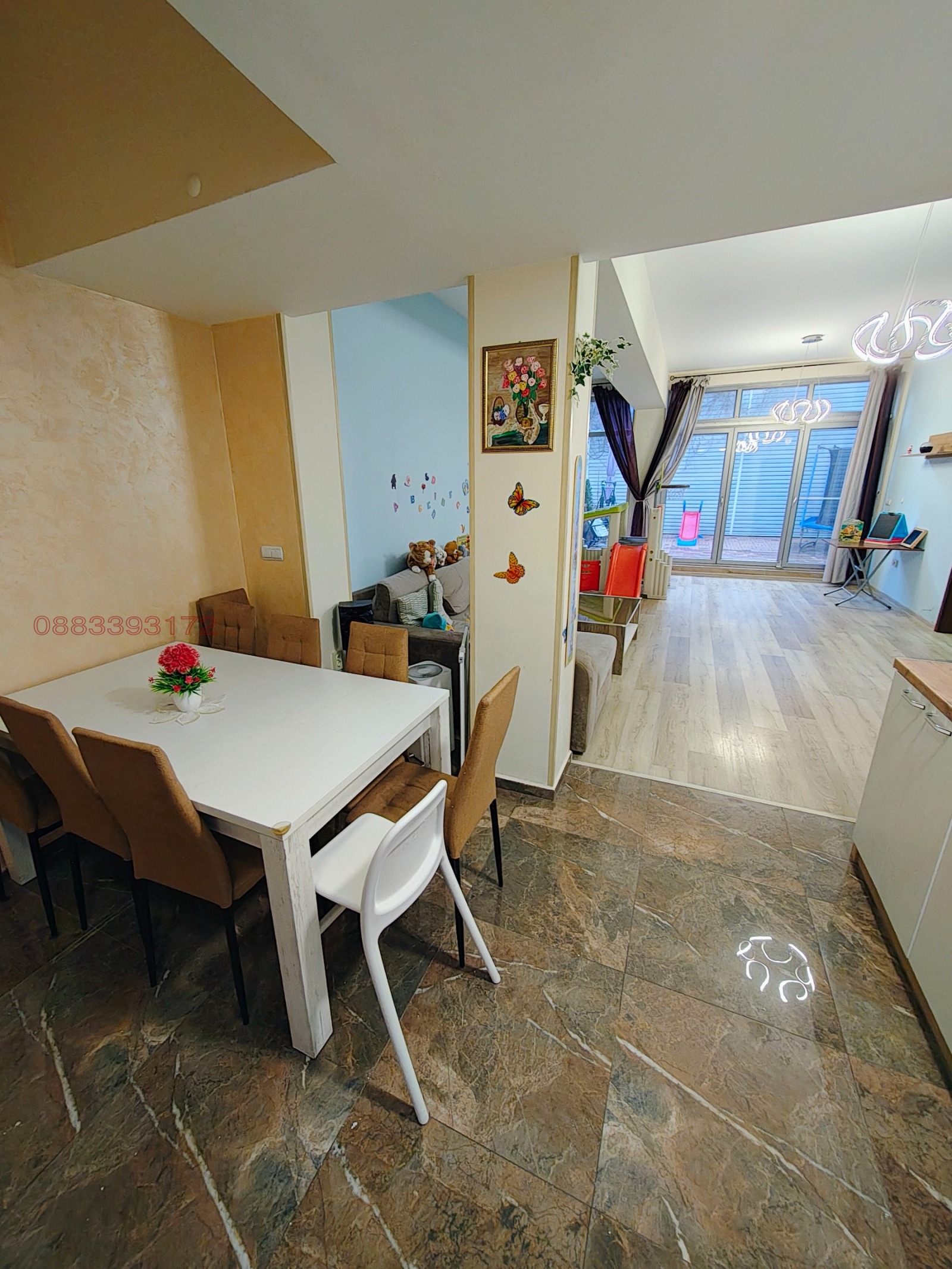 Голяма зала с кухненски бокс към нея, още две отделни стаи едната може да бъде кабинет другата заседателна зала. Две бани с тоалетни и голям тераса за отдих.