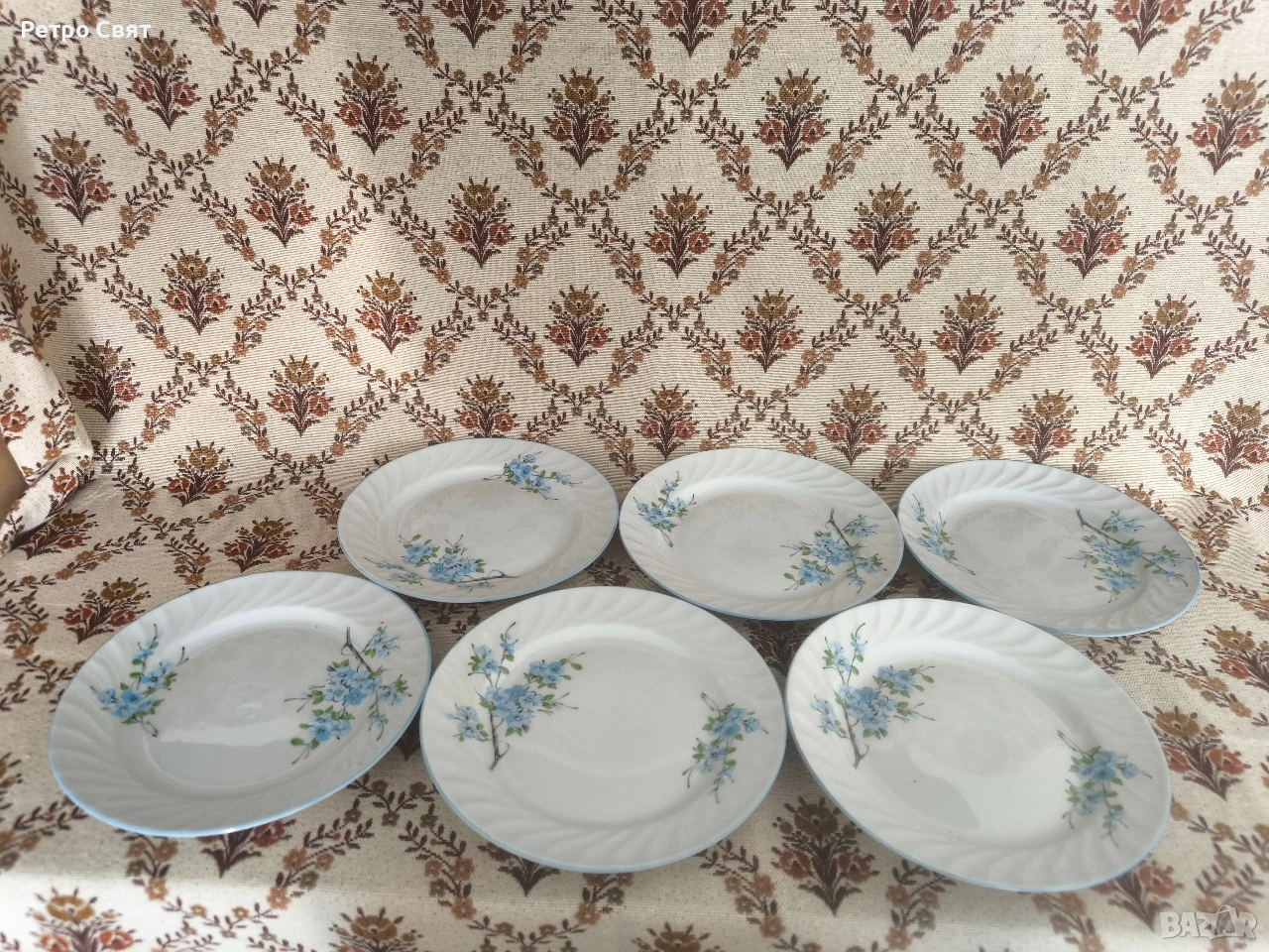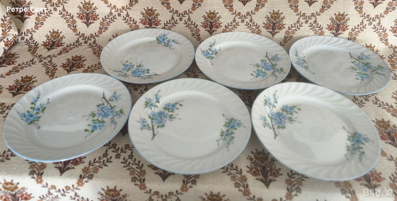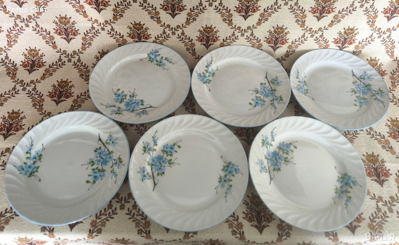 Шест броя порцеланови чинии за предястие с красив декор. Чиниите никога не са били използвани, стояли са във витрина. Състоянието видно от снимките. Без забележки.