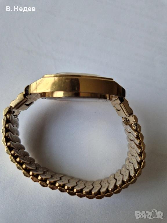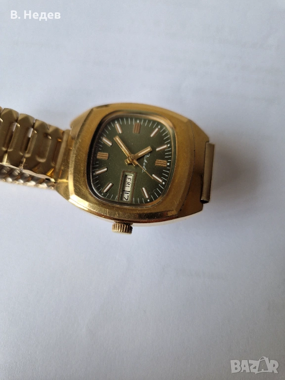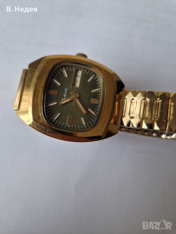 Часовника e с размери - 36,5 мм диаметър на корпуса, без коронката; от лъг до лъг - 41 мм, височина 11,0мм. Мн. приятен т. зелен цвят на ЦБ, обемни индекси, ясна четимост - моля обърнете внимание на детайлите. Касата е мн. добре запазена! Позлатена, маркирана Au> микр.! Стреч, позлатена верижка /PVD/.