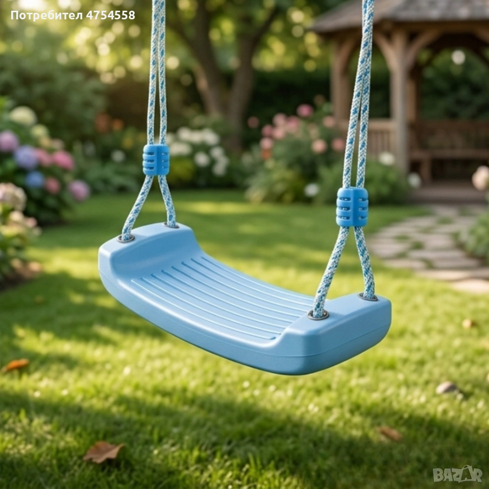 Материали: UV-устойчива пластмаса за седалката, здрави оплетени въжета, метални халки за захващане