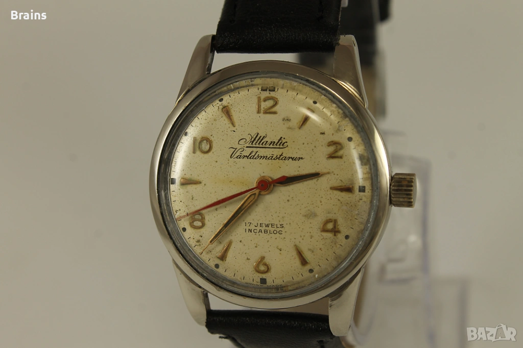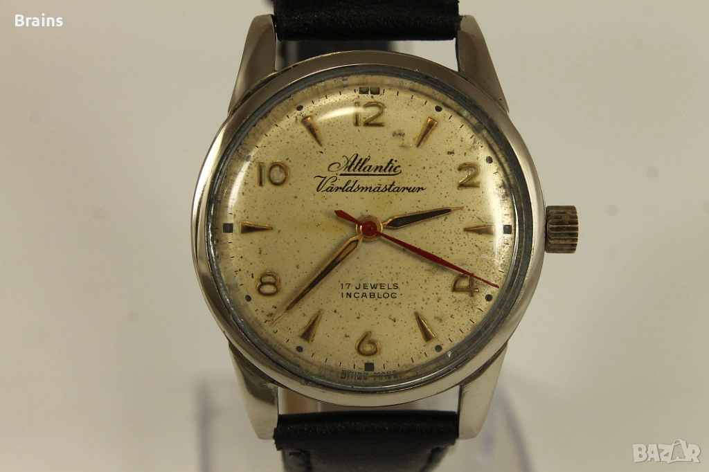 Рядък мъжки позлатен Швейцарски ръченчасовник ATLANTIC Worldmaster от 1950-те години. Циферблата и стрелките имат лека патина. Калибър AS 1188 със 17 камъка, часовника работи точно. Стоманена задна капачка.
