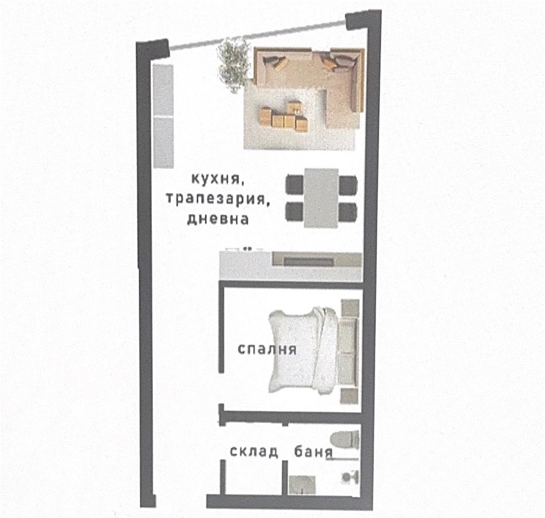 РАЗПРЕДЕЛЕНИЕ: Входно антре, просторна всекидневна с кухненски бокс и трапезария, спалня, санитарен възел и складово помещение.