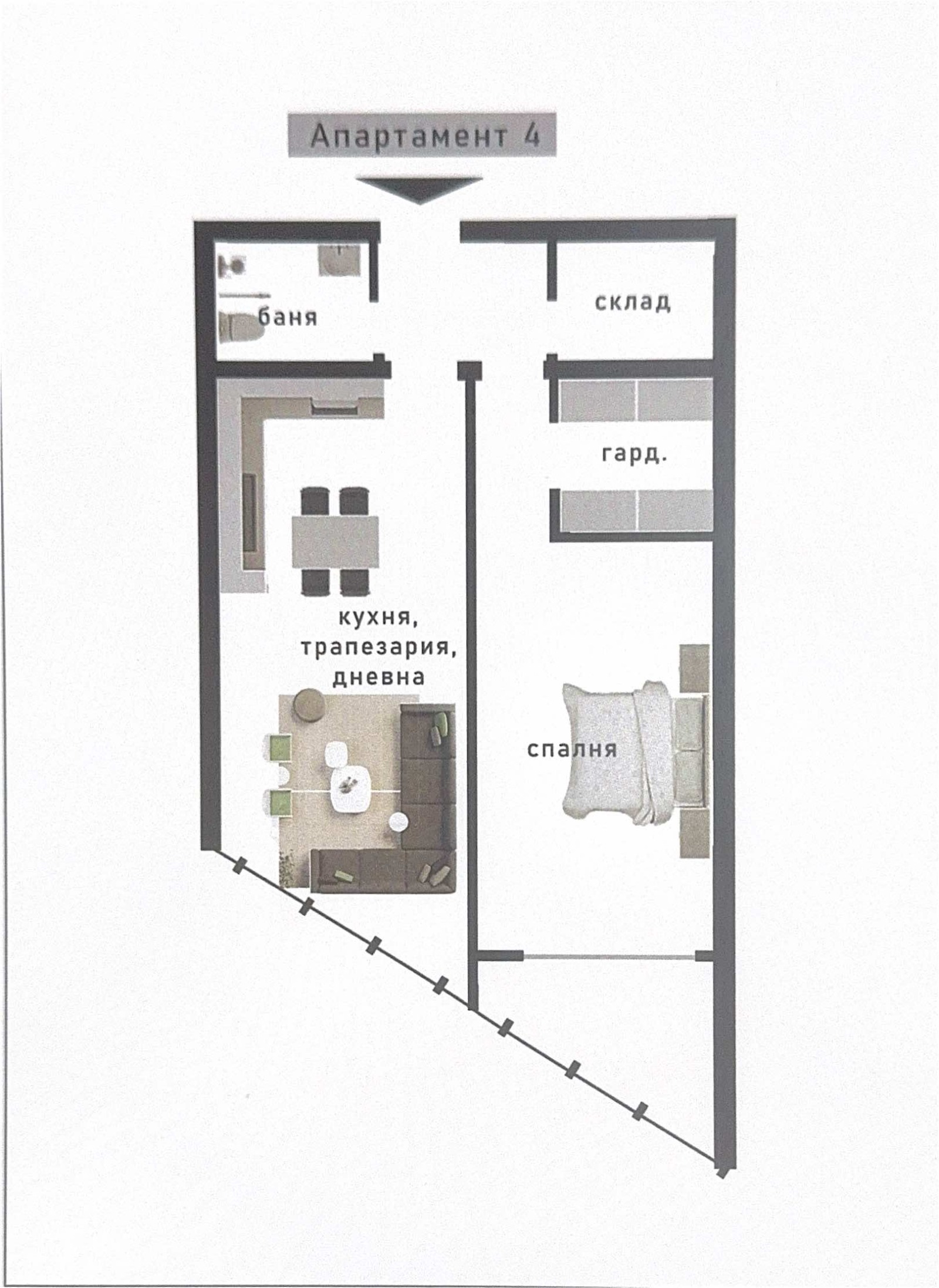 РАЗПРЕДЕЛЕНИЕ: Входно антре, просторна всекидневна с кухненски бокс и трапезария, спалня, санитарен възел и складово помещение.