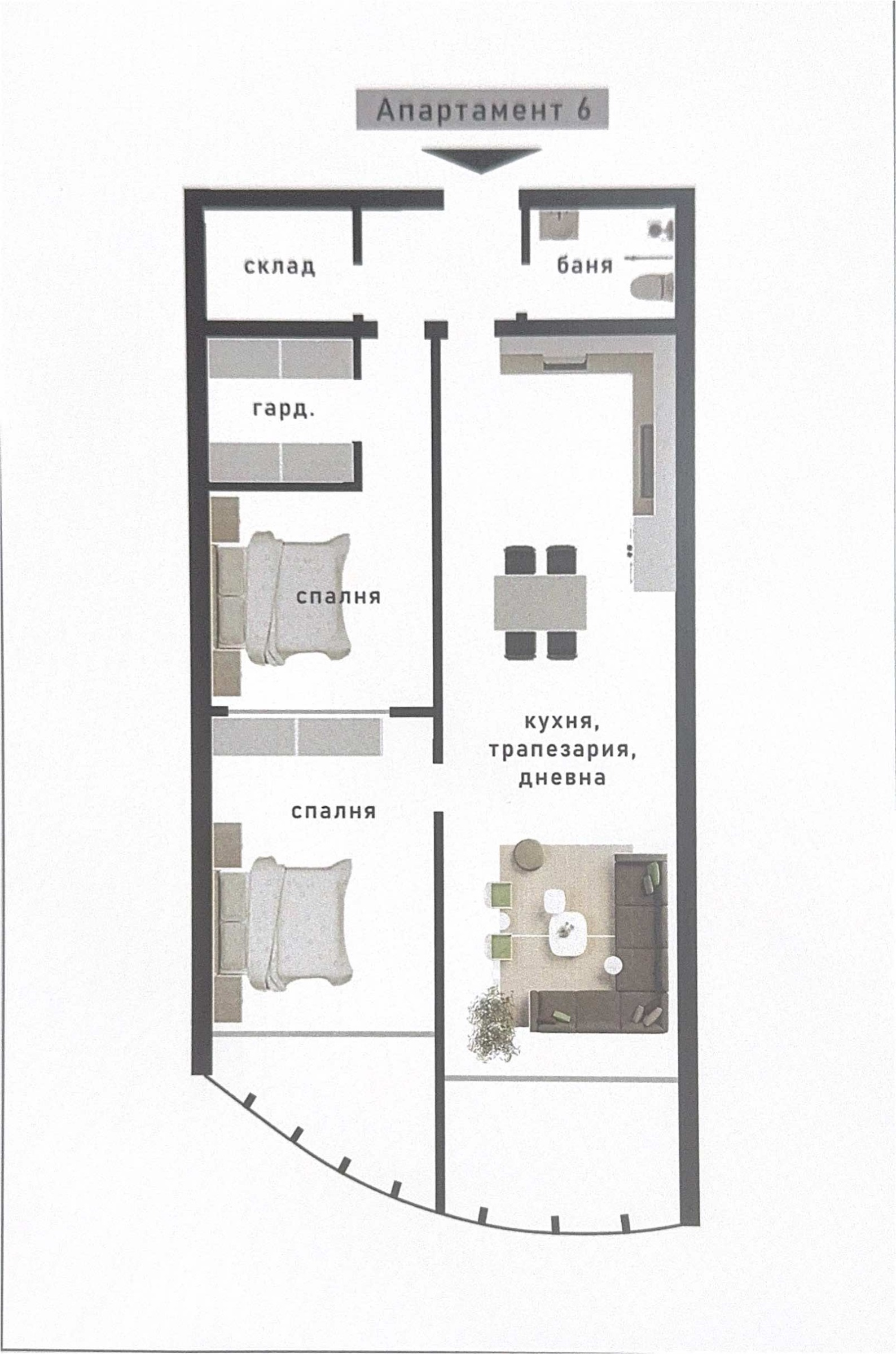 РАЗПРЕДЕЛЕНИЕ: Входно антре, просторна всекидневна с кухненски бокс и трапезария, две спални, санитарен възел и складово помещение.