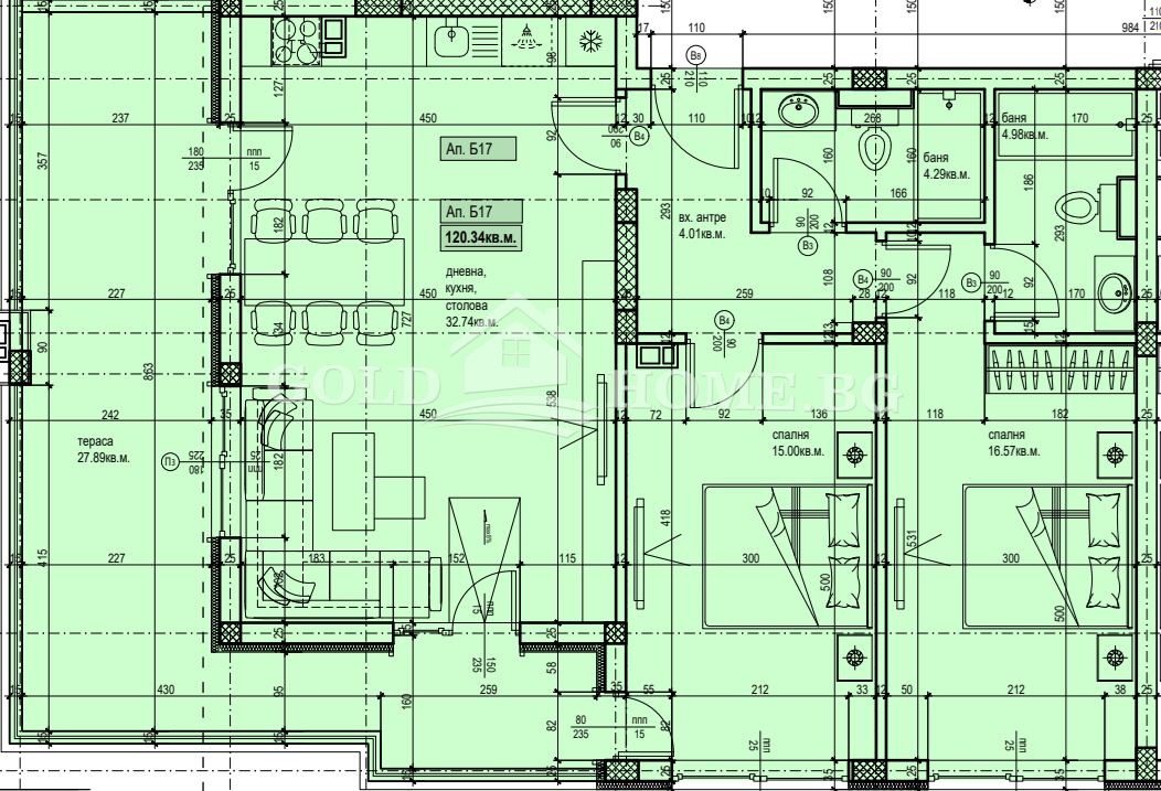 Входно антре , дневна с трапезария и кухненски бокс / между 27кв.м. и 32кв.м./ , две спални / между 14кв.м. и 16кв.м./ ,две бани с тоалетна , склад и тераса / веранда.