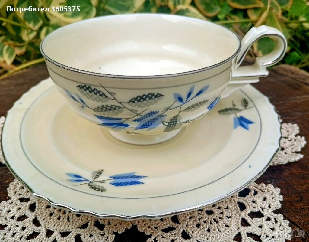 Gebruder benedikt Чехословакия.Стар порцелан от първата половина на миналия век встил" арт деко" и платинени кантове.Здрави и без забележки в цвят слонова кост,с вместимост на чашката 125 мл.Налични два сета.Цена 15 евро за сет/29,34 левс