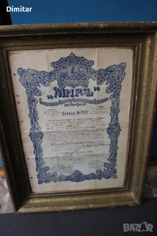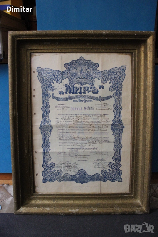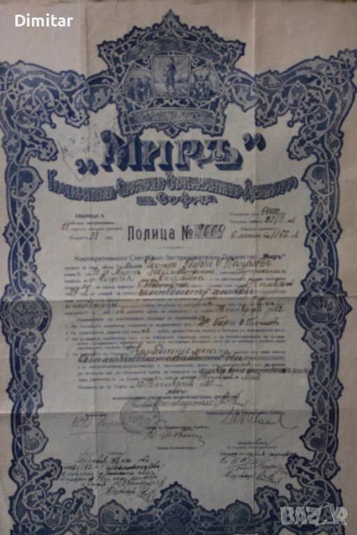 Продавам оригинална застрахователна полица от Кооперативно спестовно-застрахователно дружество „Мир“, издадена в София през 1927 година.