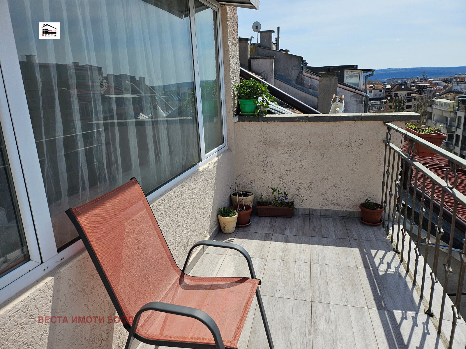 ЕКСКЛУЗИВ! БЕЗ КОМИСИОН ОТ КУПУВАЧА! С ключ! ,,Веста Имоти ООД предлага отличен тристаен апартамент. Апартамента е топъл, слънчев, много светъл и е в отлично състояние. Намира се в тухлена сграда от 2000г., без асансьор. Намира се на последен етаж, но покривът е основно ремонтиран преди година. Жилището се състои от: коридор с място за дрешник, дневен тракт с отворена кухня, с излаз на тераса, две спални с излаз на друга тераса, баня с тоалетна, изба. Апартамента е среден, без крайни стени. Спалните са с източно изложение, а дневният тракт е със западно изложение. Подовите настилки са подменени на целият апартамент преди няколко месеца. Входа е ремонтиран, отлично поддържан, с домофон и контролиран достъп с видеокамера. Паркира се свободно в междублоковото пространство. ,,Веста Имоти извършва всички необходими юридически и технически проверки на имота, който сте избрали, организира всички етапи на сделката до нейното финализиране с нотариално прехвърляне на имота; наемни отношения. Фирмата съдейства за отпускане на банков кредит при възможно най-добри условия за клиента.