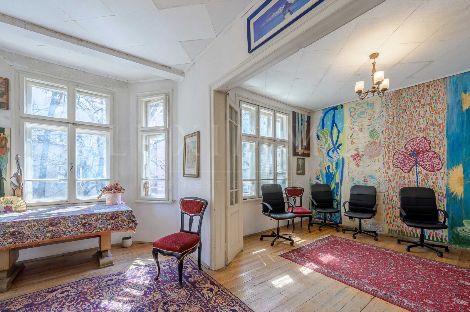 В момента имотът се използва като офис, което го прави напълно подходящ както за продължаване на бизнес дейност, така и за преустройство в просторен градски апартамент или комбинация от двете.
