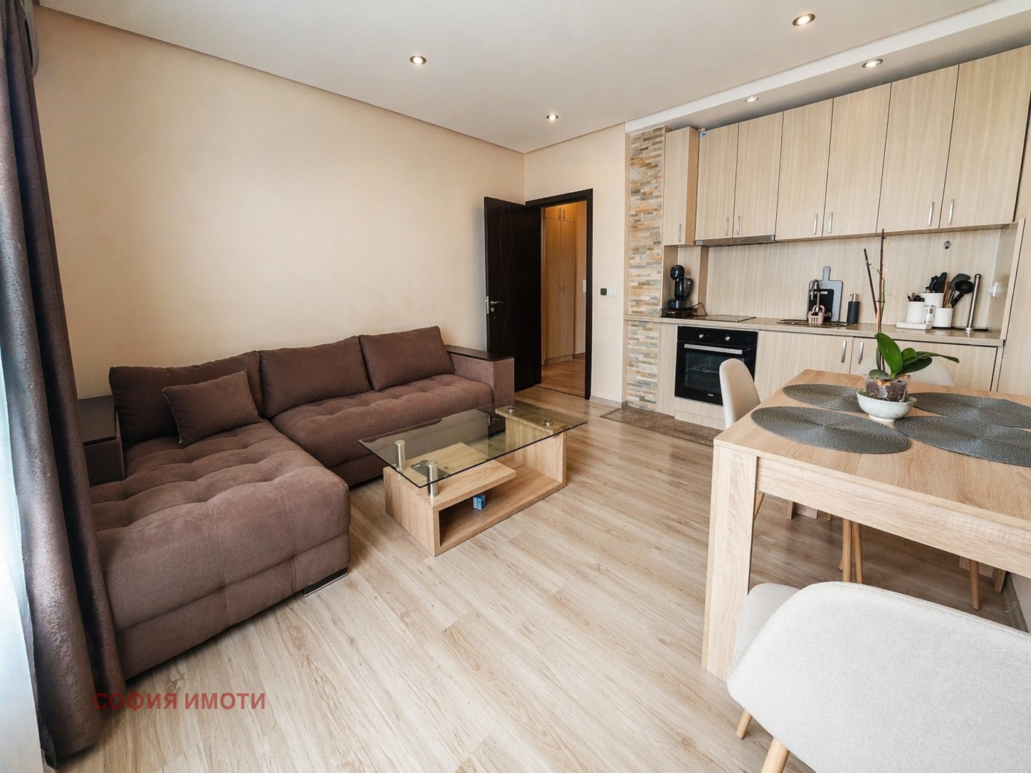 Апартаментът впечатлява със светла дневна с обособен кухненски бокс и трапезарна част, изпълнена в топли, естествени тонове. Пространството е приятно организирано, с мека мебел, TV зона, климатик, трапезна маса и напълно оборудвана кухня с вградени електроуреди, шкафове и всичко необходимо за ежедневен комфорт.