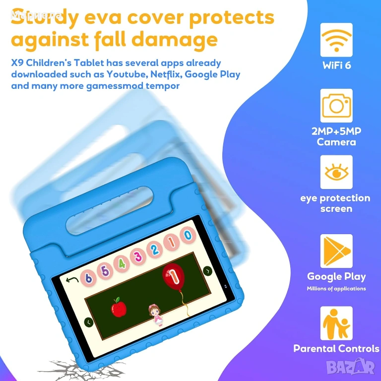 Детският таблет YESTEL X9 има 7 GB RAM и 64 GB ROM вътрешна памет. Поддържа до 1 TB micro SD карта (не е включена). Така че може да съхранява много електронни книги, филми, снимки и др. Сертифициран е от Google GMS и можете да изтеглите необходимите приложения от Google Play Store: Disney+, Youtube, Netflix и други.
