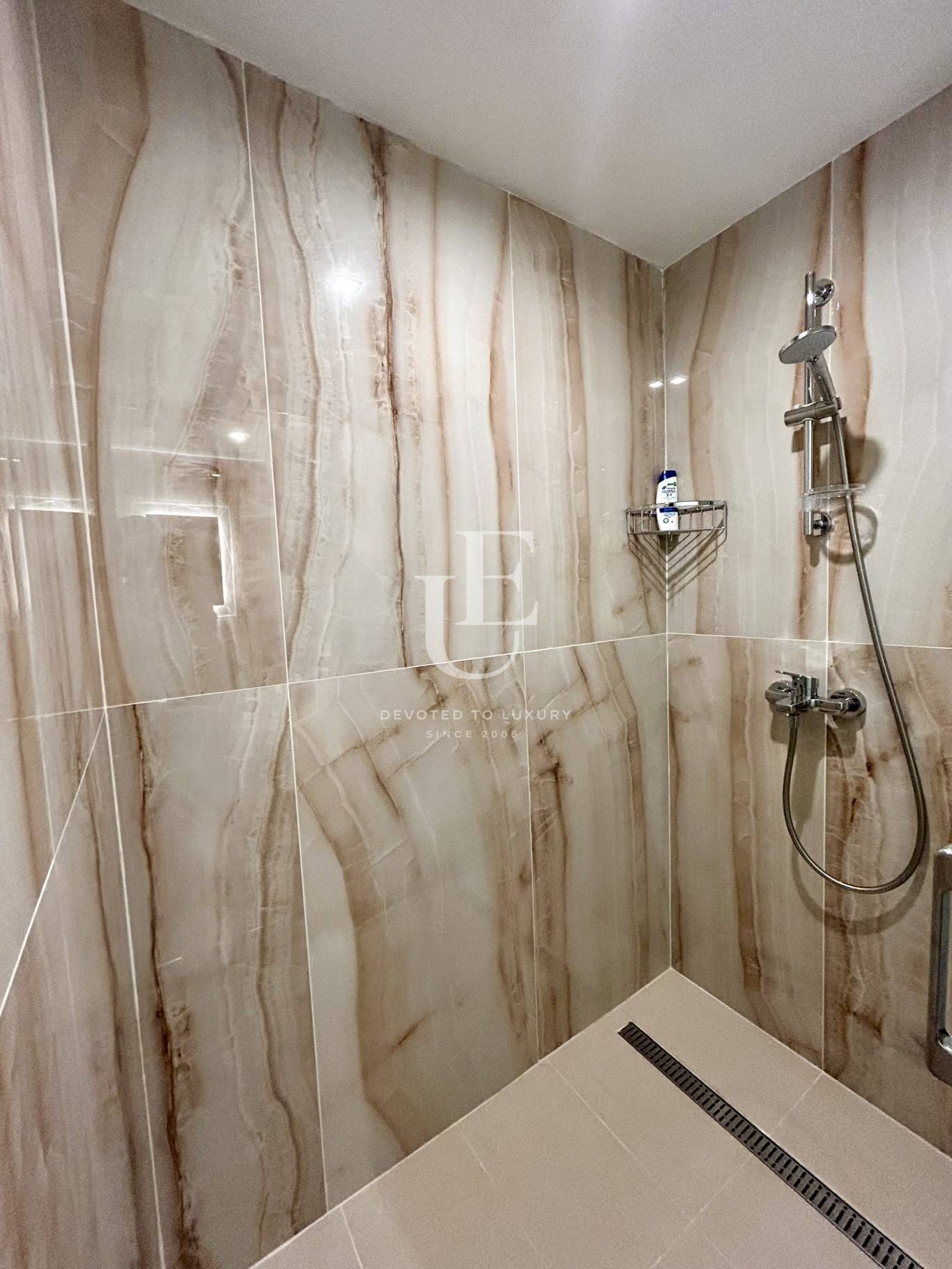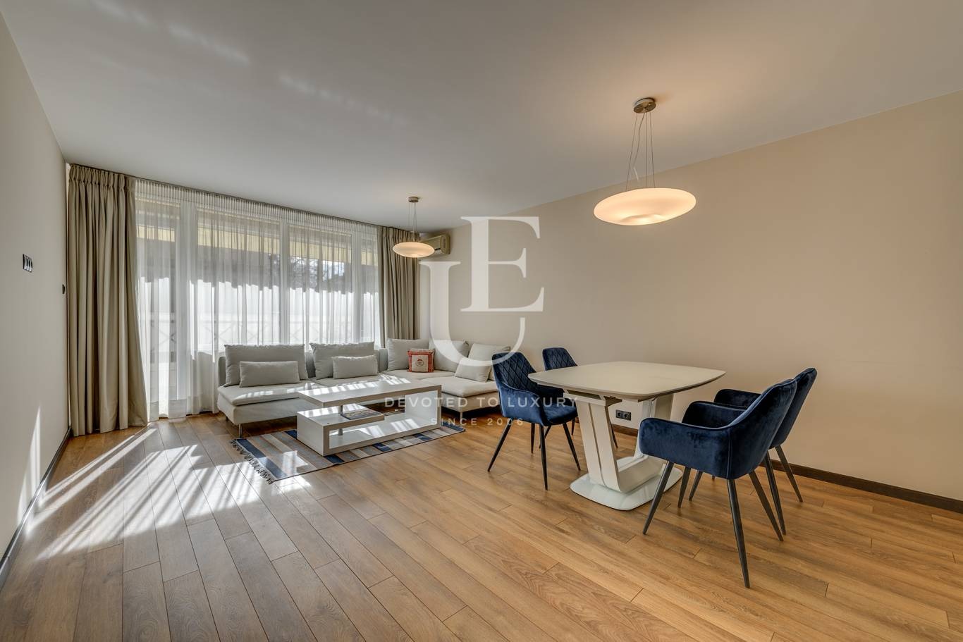 Апартаментът е с обща площ от 145 кв.м., с елегантно обзавеждане и функционално разпределение. Разполага с напълно оборудван кухненски бокс, просторна южна всекидневна с излаз към уютна тераса, както и две спални, едната от които е оставена да се обзаведе спрямо нуждите на бъдещите собственици и също има достъп до терасата. Жилището включва още две бани и голямо мокро помещение, което позволява обособяване на трети санитарен възел. Към имота има възможност за закупуване на два надземни гаража.